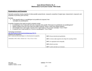 This document outlines a 14-session unit on measuring polygons for a 5th grade mathematics curriculum. The unit focuses on classifying and measuring two-dimensional figures. Students will learn about attributes of 2D figures like angles and sides, and how these relate to calculating figures' areas and perimeters. They will classify figures into hierarchies based on their geometric properties and understand how categories are related. Examples include learning all rectangles have four right angles, so squares do as well. The unit aligns with Arizona math standards and incorporates mathematical practices like reasoning quantitatively.