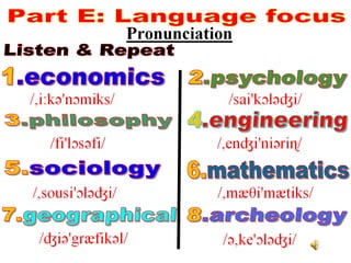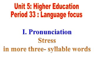 The document provides information on pronunciation rules for suffixes in English. It notes that the stress shifts to the syllable before suffixes like -TION, -SION, -IC, -ICAL, -IBLE, -ITY, and -LOGY. It also notes that the stress falls on the second syllable counting from the right for suffixes like -ATE, -ARY, and -IZE, with some exceptions. It provides example words to demonstrate these rules. It then provides sample sentences for students to practice reading words with these suffixes.