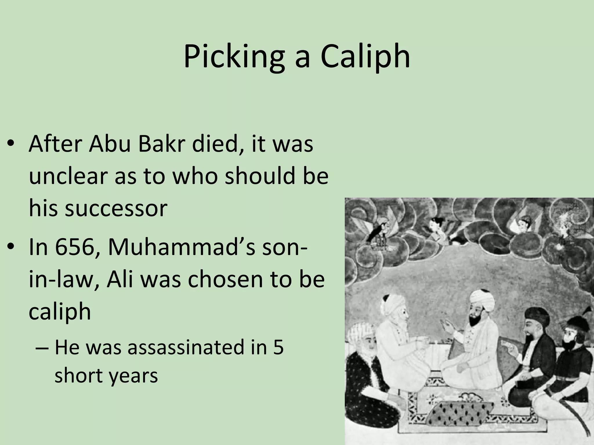 After the death of Abu Bakr, disputes over succession led to the establishment of the Umayyad dynasty in 661. The Umayyads expanded the Islamic empire significantly but faced revolts due to discrimination, splitting Islam into the Sunni and Shia sects. In 750, the Abbasid dynasty overthrew the Umayyads and moved the capital to Baghdad, ushering in a period of prosperity. However, regional rulers gained independence and the Fatimid dynasty was later overthrown by the Seljuk Turks, leading the Byzantine emperor to request Christian assistance and launching the Crusades between Christians and Muslims.