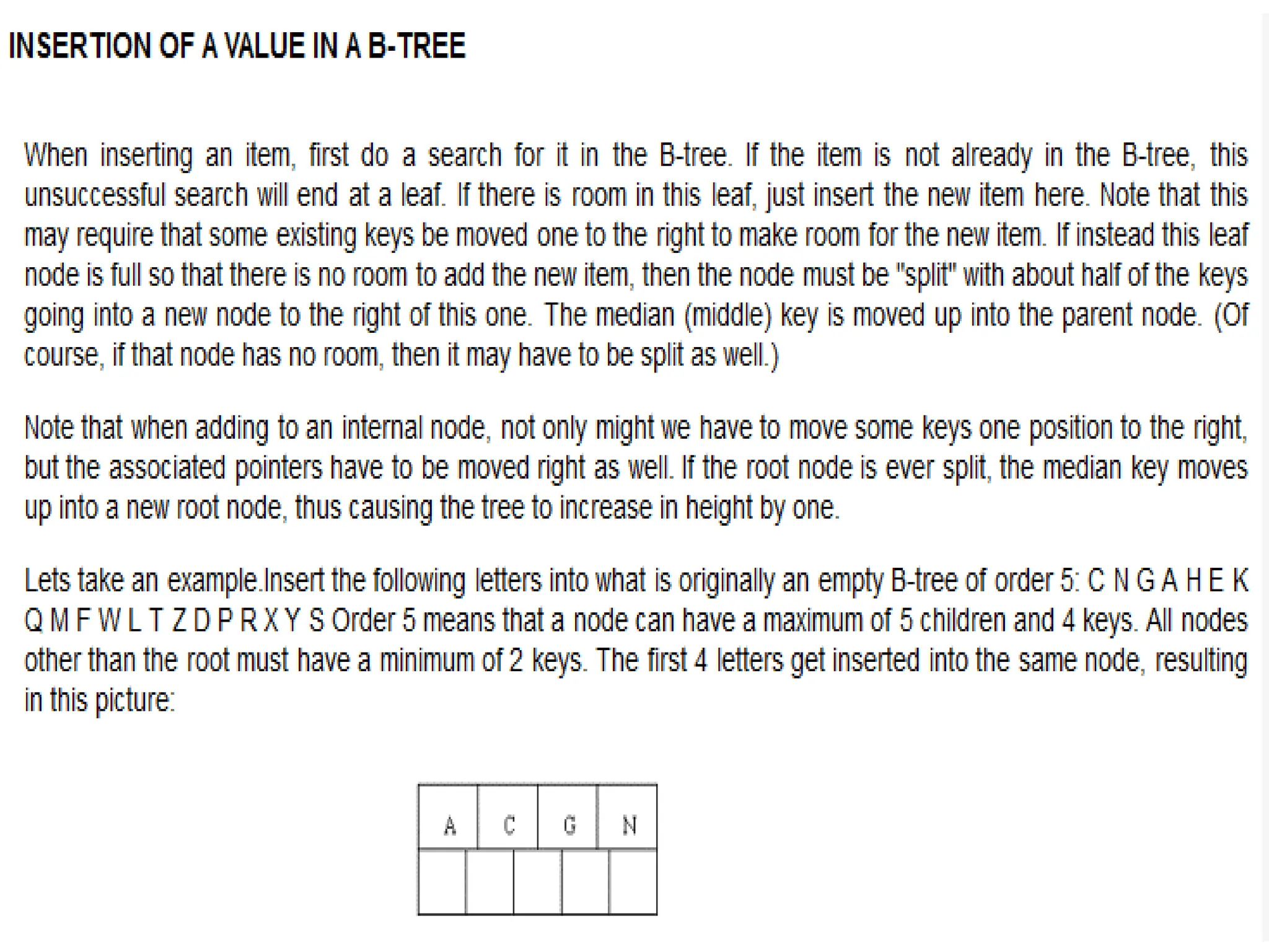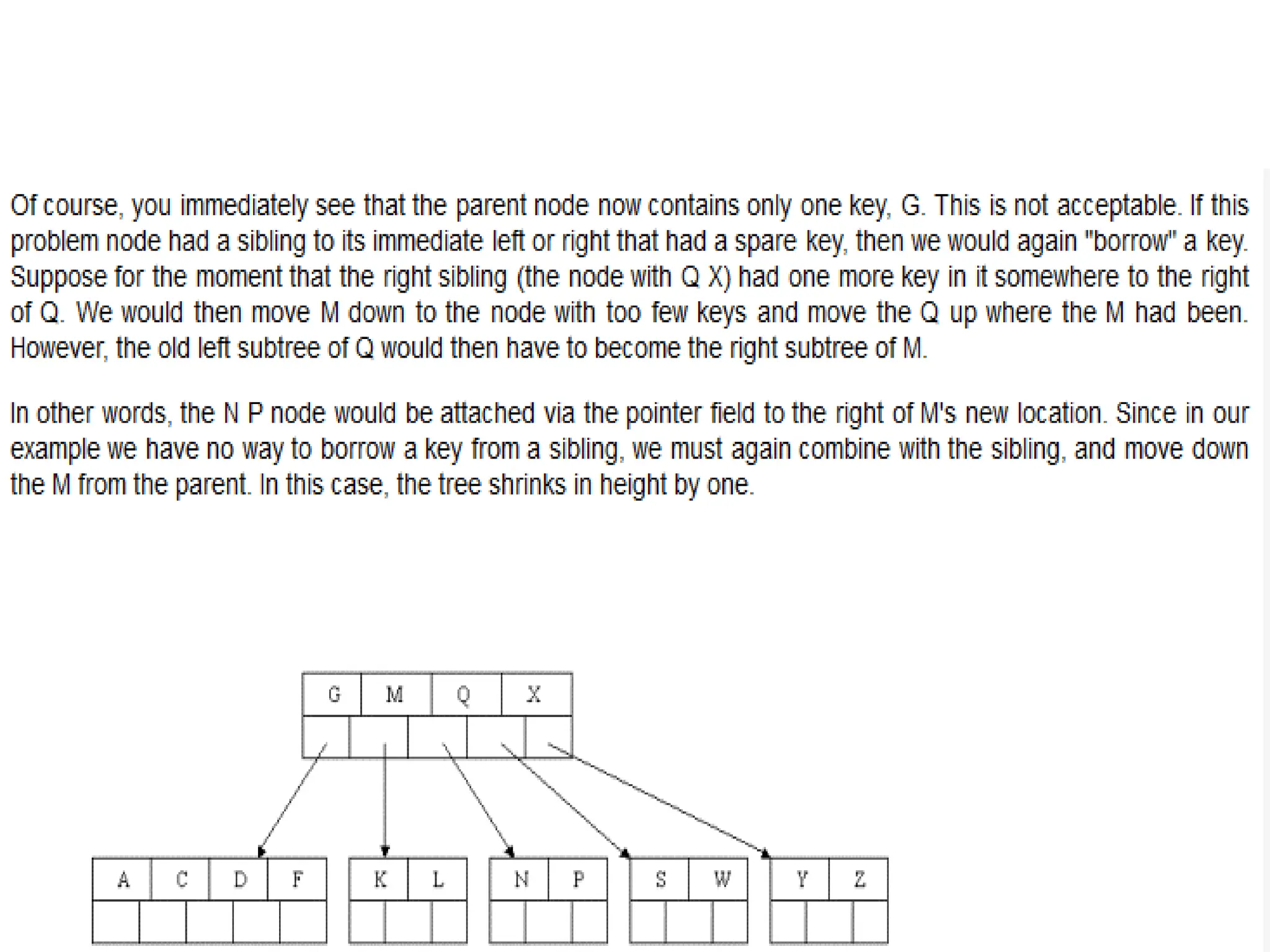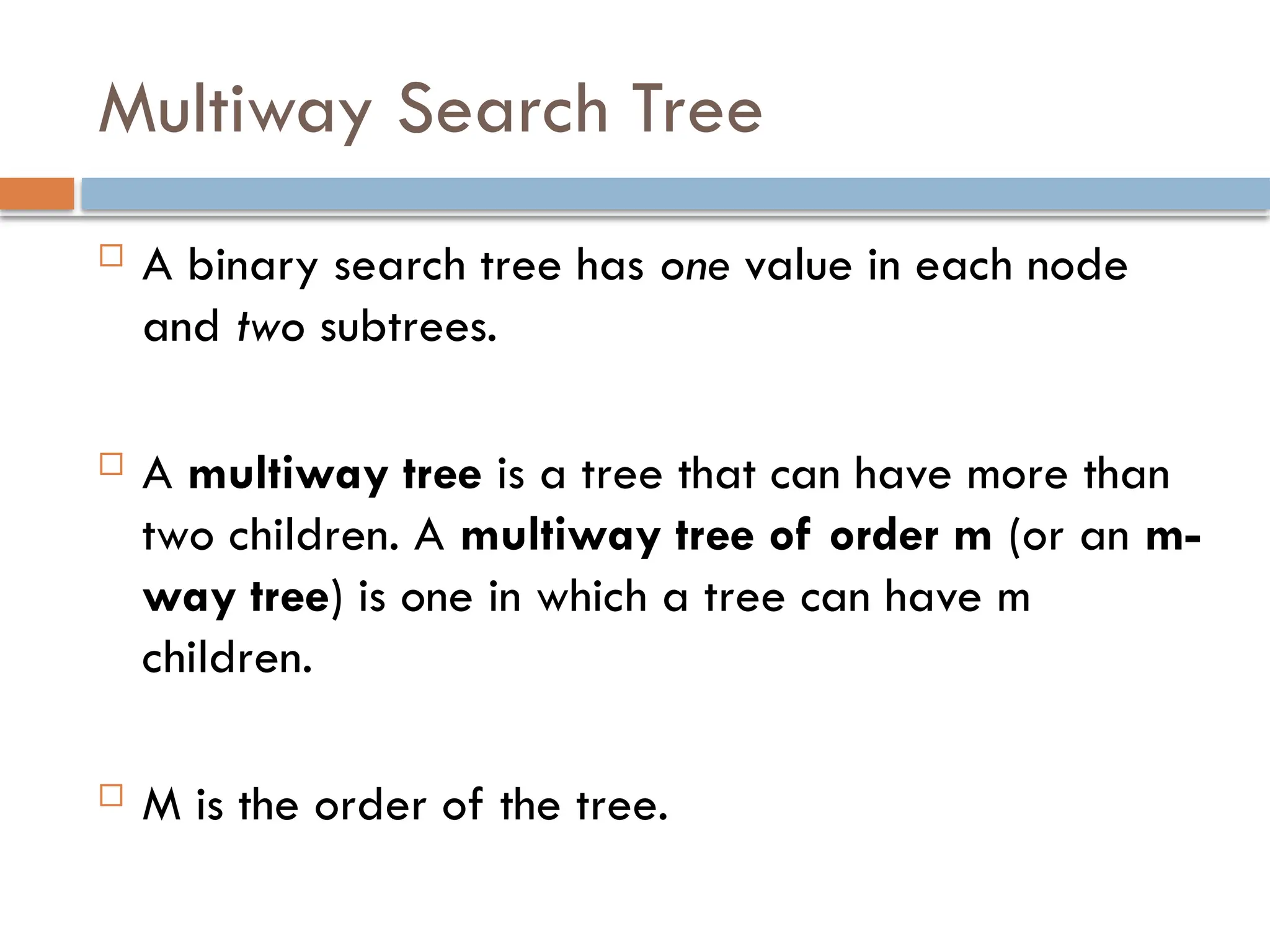 The document explains m-way search trees, which are multiway trees allowing nodes to have multiple children and keys stored in ascending order, enhancing search operations compared to binary trees. It details properties and algorithms for searching within m-way trees and describes B-trees, a type of balanced m-way tree with specific structural rules that optimize data retrieval from secondary storage. Examples of creating B-trees with various orders illustrate the application of these concepts.
