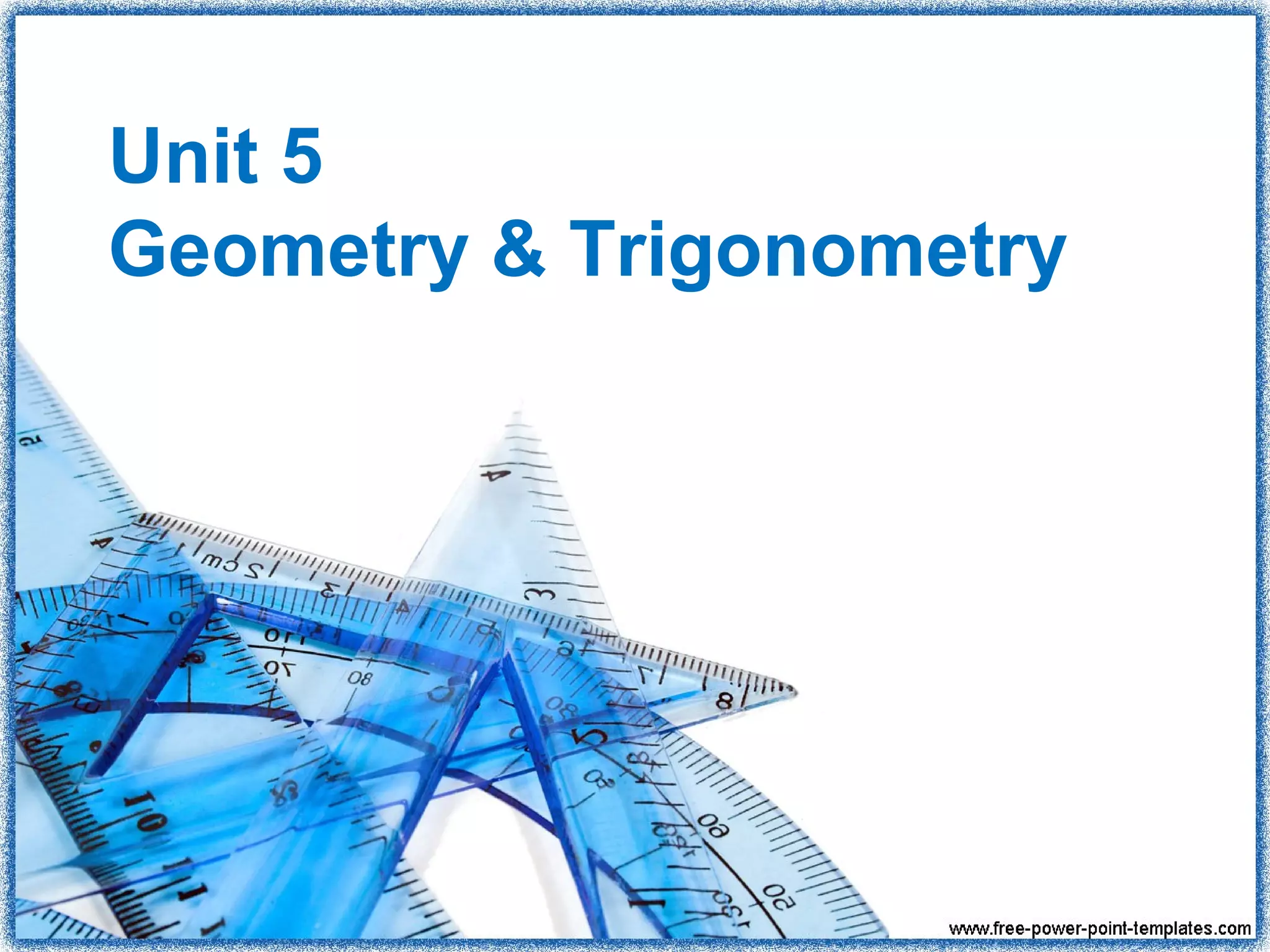 This document provides an overview of geometry and trigonometry concepts covered in Unit 5. It begins by defining geometry and trigonometry. Properties of triangles such as right, isosceles, and equilateral triangles are discussed. The unit then covers trigonometric ratios including sine, cosine, and tangent. It provides examples of how to use trigonometry to solve problems and applications involving navigation, carpentry, and architecture. Finally, the law of sines and law of cosines are introduced as methods for solving oblique triangles. Worksheets and practice problems are included.