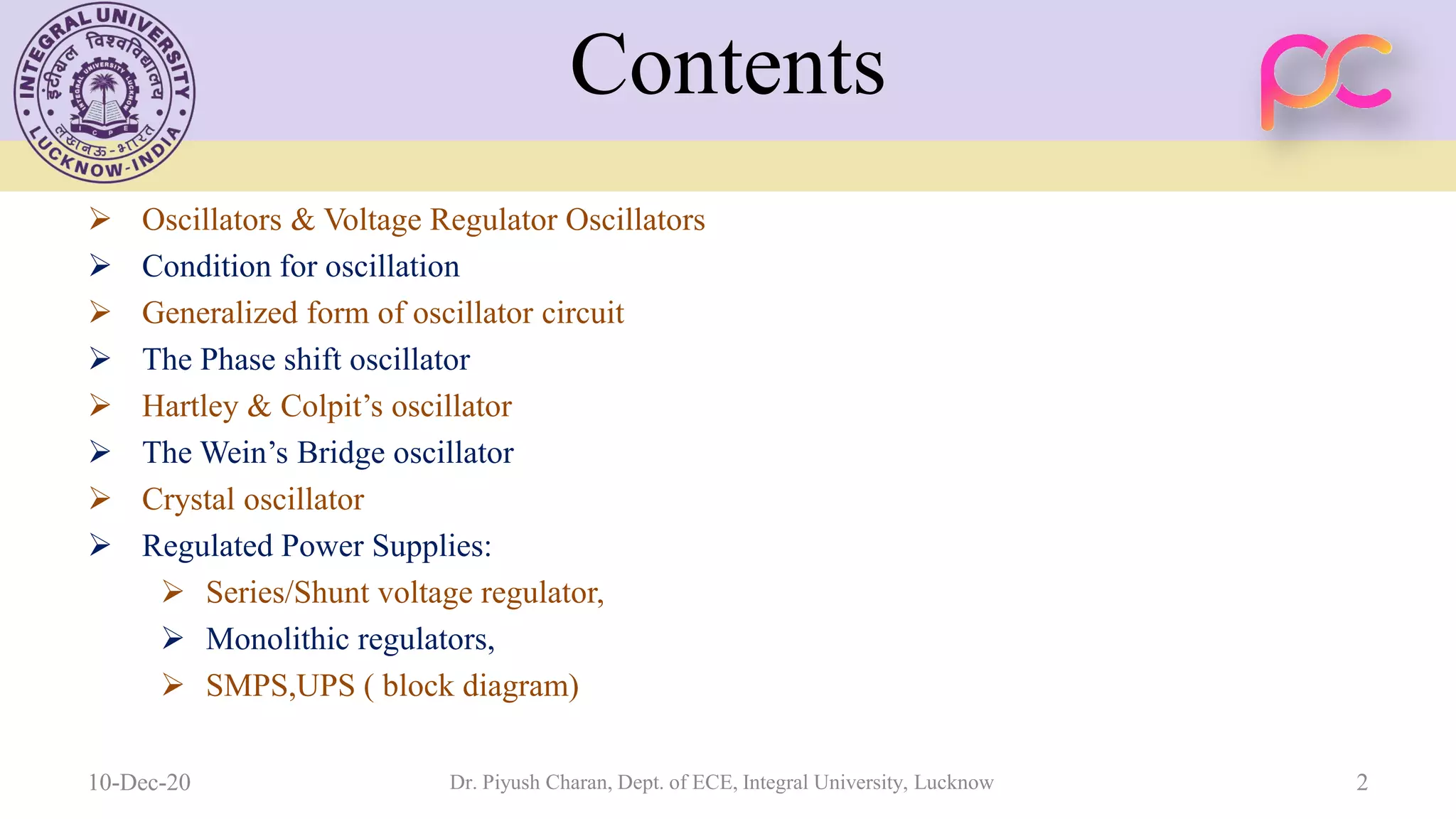 - The document discusses oscillators and voltage regulators, including oscillator circuits that convert DC to AC like the phase shift oscillator, Hartley oscillator, and Wein bridge oscillator. - It also discusses regulated power supplies including series/shunt voltage regulators, monolithic regulators, and switching mode power supplies (SMPS). Key types of oscillators are classified as sinusoidal oscillators generating sine waves and non-sinusoidal oscillators generating square or sawtooth waves.