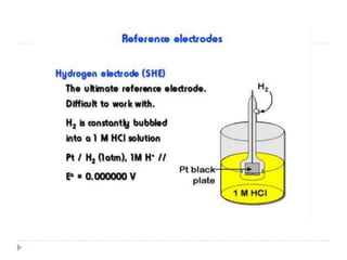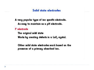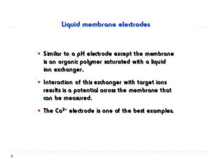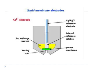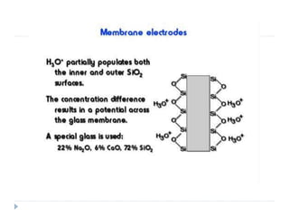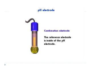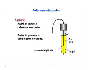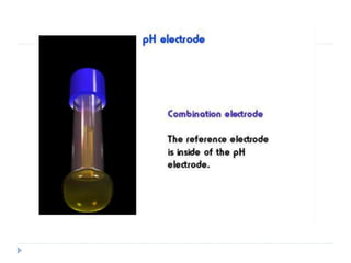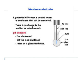The document discusses potentiometric titration, a technique that measures voltage across an analyte without using indicators. It involves two electrodes and plots voltage against the volume of titrant added to determine the endpoint of the reaction. The document also outlines different types of potentiometric titrations including acid-base, redox, and precipitation titrations.