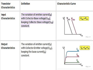 The document provides an overview of bipolar junction transistors (BJTs), highlighting their structure, operation, and configurations such as common emitter, common base, and common collector. It explains the functionality of BJTs as amplifiers, detailing the roles of majority and minority carriers, and introduces the Ebers-Moll model for analysis. Key concepts like the early effect, input and output characteristics of transistors, and their applications in various communication systems are also discussed.