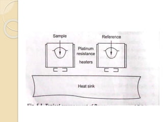 This document discusses various types of materials testing including mechanical, non-destructive, thermal, electrical, and corrosion testing. It focuses on thermal properties testing methods like thermal analysis, thermal testing, thermogravimetric analysis, differential scanning calorimetry, differential thermal analysis, and thermo-mechanical analysis. These techniques measure how a material's properties change with temperature and provide information on transitions, reactions, and dimensional stability. The principles, components, applications, and advantages of each technique are described over multiple sections.