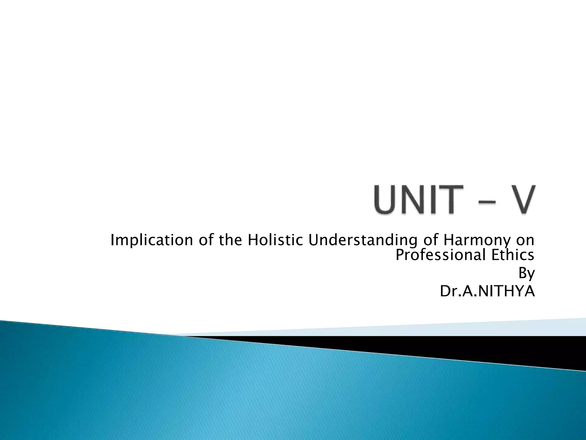 This document discusses the implications of a holistic understanding of harmony on professional ethics. It defines key concepts like values, morals, ethics, and professional ethics. It explains that good professionals have both strong ethical conduct and requisite job skills. Having the right understanding enables identifying definitively ethical human behavior in terms of values, policies, and character. This definitiveness in ethical conduct is important for professionals and brings positive changes at individual, family, societal and environmental levels when adopted. The document also discusses issues in professional ethics and suggests various measures to address them holistically.
