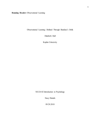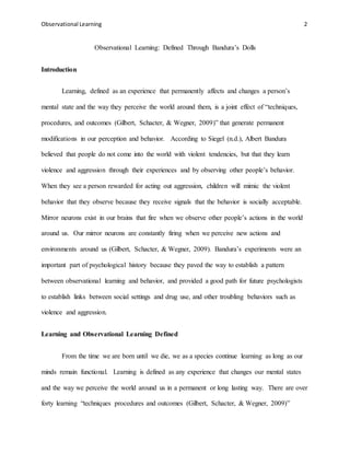 Bandura conducted an experiment using Bobo dolls to demonstrate observational learning. In the experiment, children watched a video of adults playing with dolls, with some adults aggressively hitting and kicking the dolls. Later, the children who saw the aggressive modeling behaved aggressively towards the dolls, while children in a control group did not. This supported Bandura's theory that people can learn aggression through observing others rewarded for that behavior. Observational learning occurs through mirror neurons firing both when we observe an action and perform it ourselves. Bandura's experiments were important for establishing links between social learning, behavior, and issues like violence.