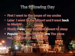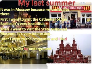 - The document describes the narrator's activities over the summer holidays. It details trips to London, Matalascañas, and Sabinillas where they visited attractions like Big Ben and stayed in hotels. Time was also spent with family, including cousins who visited from other towns. Various activities were enjoyed like ping pong, swimming, and art lessons. The summer passed quickly.