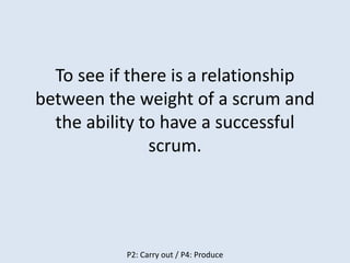 Iain Lynch conducted a research project to determine if there is a relationship between rugby pack weight and scrum success. He collected weight data for players on various teams and calculated average pack weights. He also collected scrum statistics to determine success rates. His results showed a correlation between heavier average pack weight and higher scrum success rates. However, the team with the lowest average pack weight was also the top team in the league, showing pack weight does not guarantee overall success due to other important factors. Lynch's research supported the hypothesis that heavier packs are more successful in scrums on average.