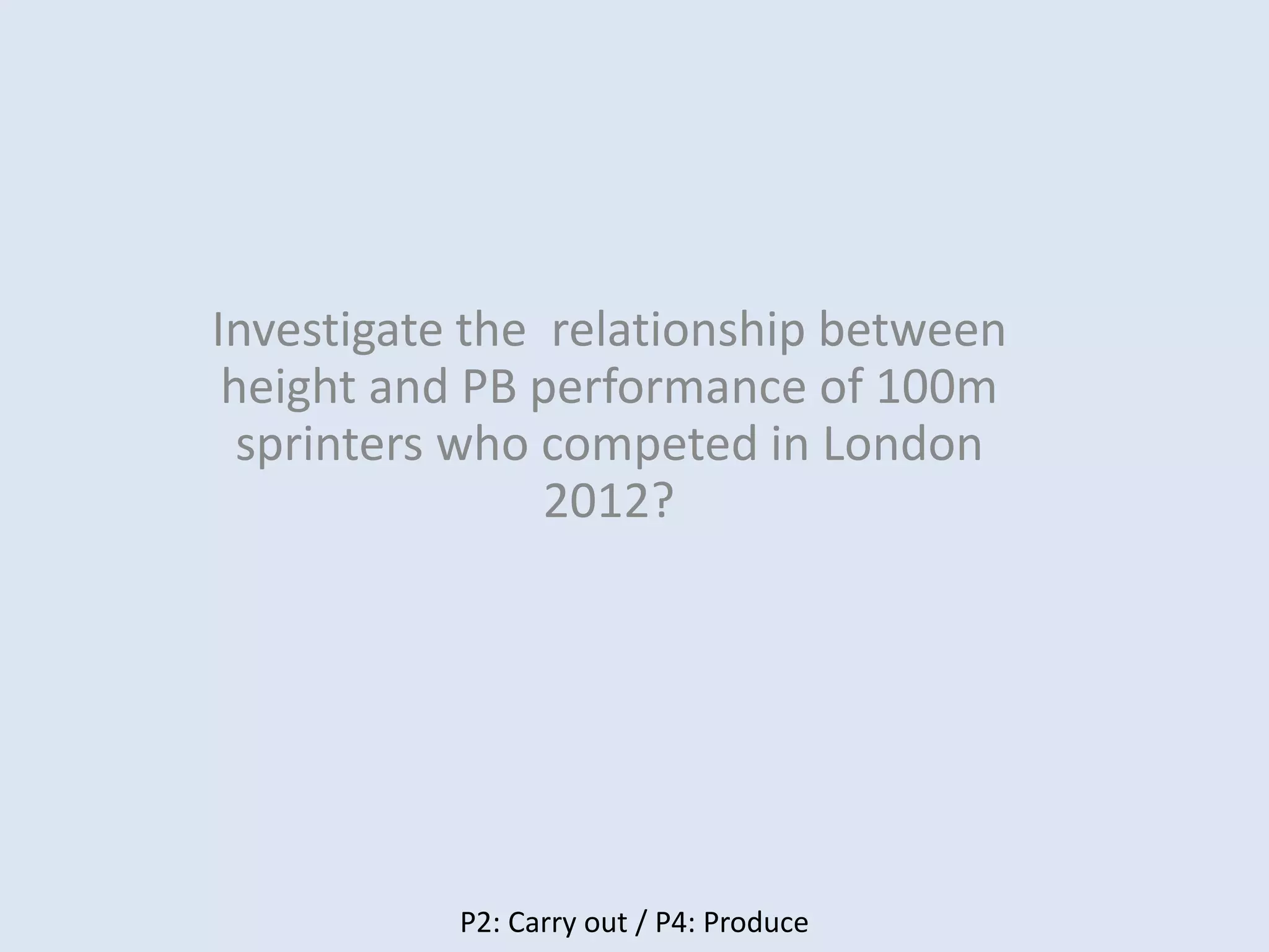 - The author investigated the relationship between height and 100m sprint performance for athletes competing at the 2012 London Olympics. They collected height and personal best time data for 73 elite male sprinters from sources like the IAAF website.