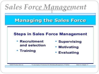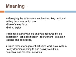 The document discusses key aspects of sales force management including: