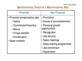 5. Methods of motivating the sales force including compensation plans involving salary, commission, or a combination.