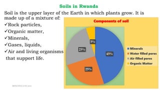 The document discusses the types of soils present in Rwanda, including their characteristics, formation, and distribution. It highlights the impact of climate, parent rock, and topography on soil formation, as well as the causes and effects of soil erosion in the region. Additionally, it emphasizes the importance of soil conservation methods to mitigate the adverse effects of erosion and improve agricultural productivity.