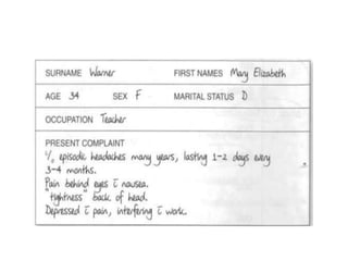 The document outlines the process of taking a medical history from a patient, detailing aspects such as greetings, the structure of the history, and key components like presenting complaints, past medical history, and social history. It emphasizes the importance of patient-centered questioning techniques to gather comprehensive information while building rapport. Various mnemonics like 'SOCRATES' and 'MJTHREADS' are introduced to aid in the efficient collection of relevant medical data.