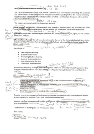 The document provides a brief for creating video content for a staff awards ceremony. It outlines key deliverables including a title sequence, interviews with award recipients, and recording the ceremony. The brief contains important information like deadlines, award categories, and the client's requested format. It also provides opportunities for the students to improve skills like planning, public speaking, correspondence, directing, and experience working on a multi-camera production.