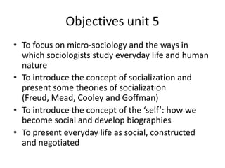 To introduce key concepts related to micro-sociology and socialization. The document discusses theories of socialization from Freud, Mead, and Cooley. It also addresses the concepts of self, human nature, and how individuals develop identities and learn social norms through the socialization process with different agents such as family, schools, peers, and media.