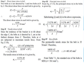 The document discusses screw fasteners, including types of fasteners like bolts and nuts, definitions of threaded joints, and classifications of screw threads based on their purpose and configurations. It elaborates on design considerations such as resilience, strength in tension and shear, and methods for calculating the size of bolts and the effects of eccentric loading on joints. Additionally, it covers the design of turnbuckles for tension adjustments in structural applications.