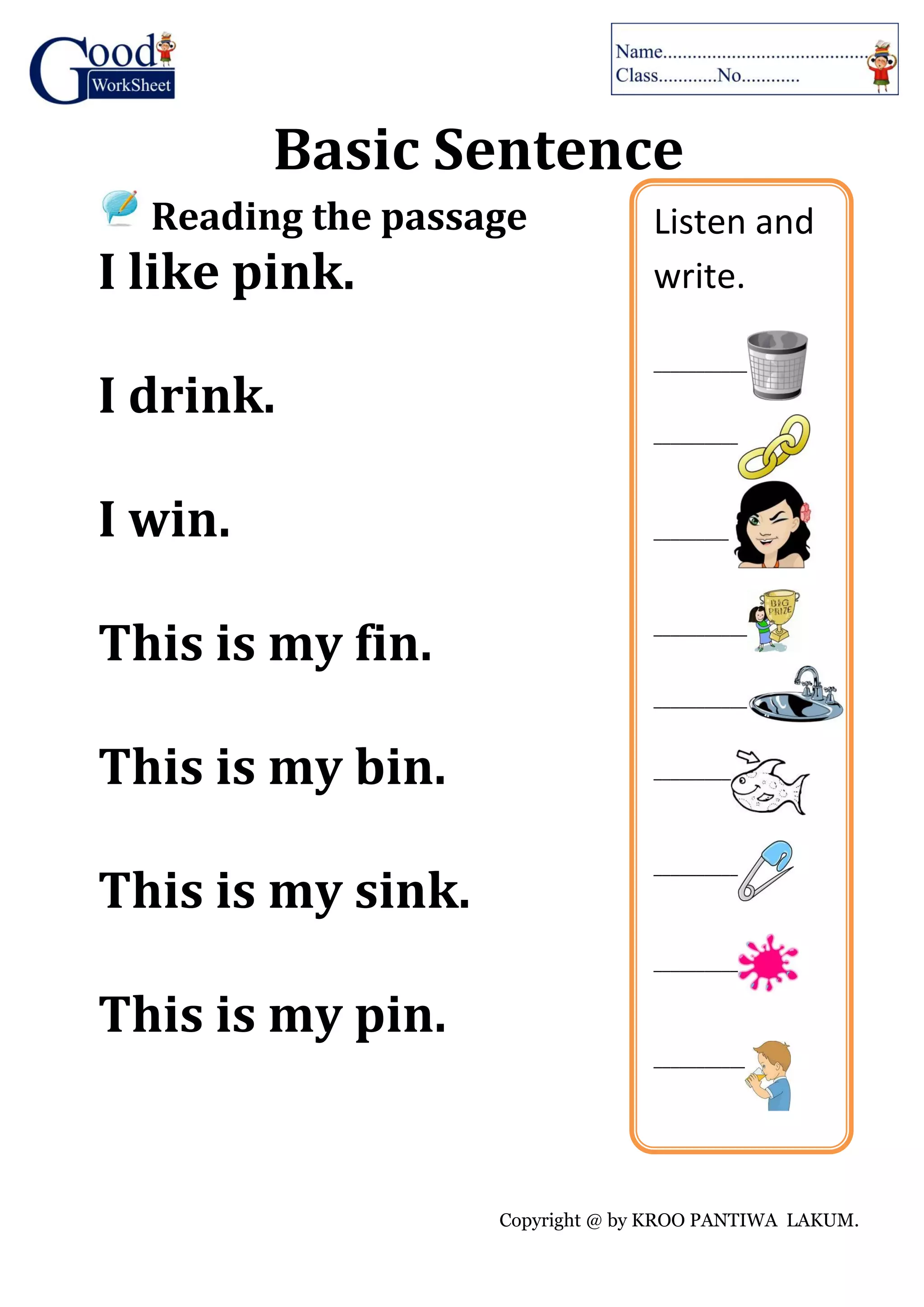 This short document contains a copyright notice and then lists simple sentences using common one-syllable words like "pink", "drink", "win", "fin", "bin", "sink", and "pin". It instructs the reader to listen and write the sentences.