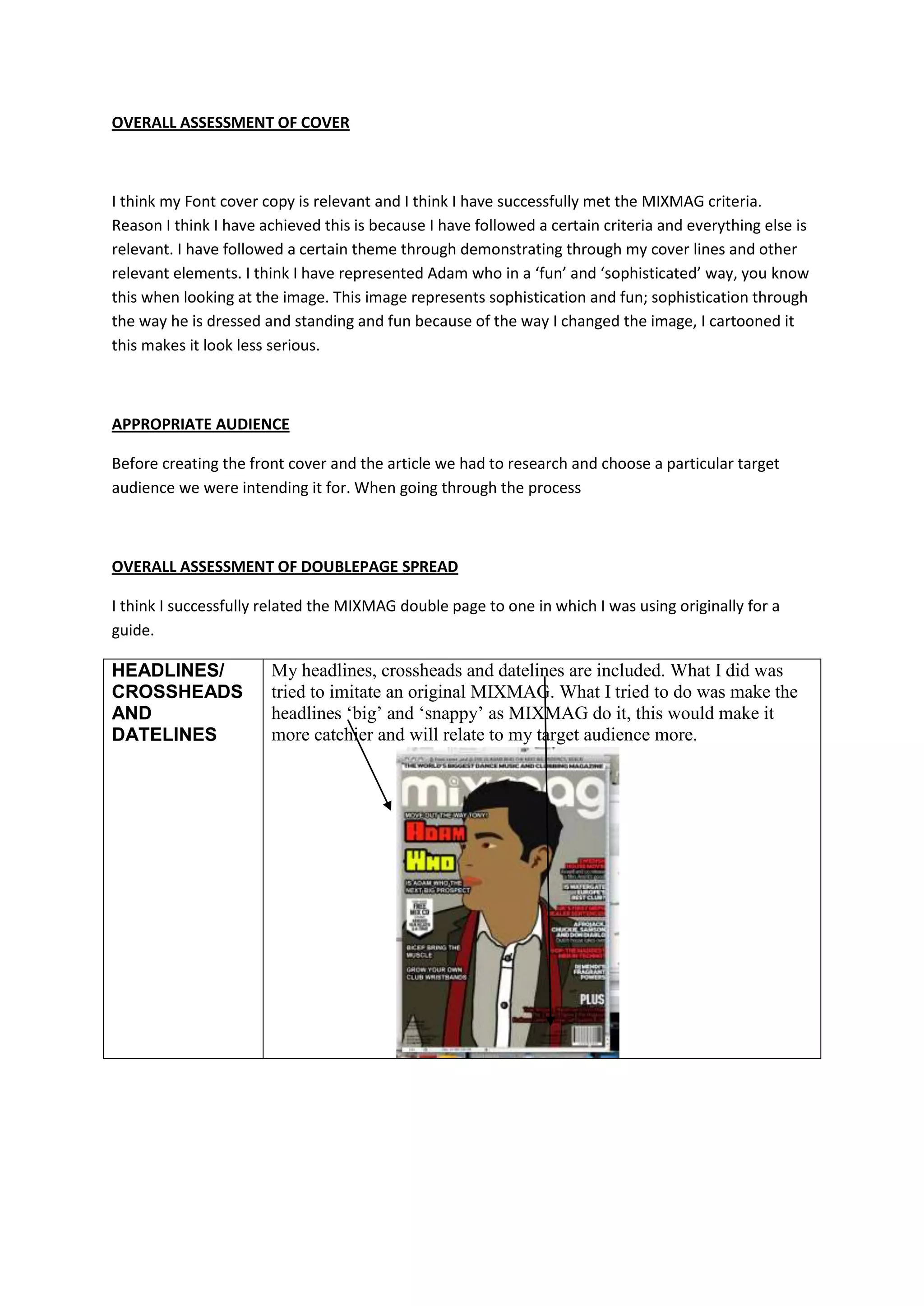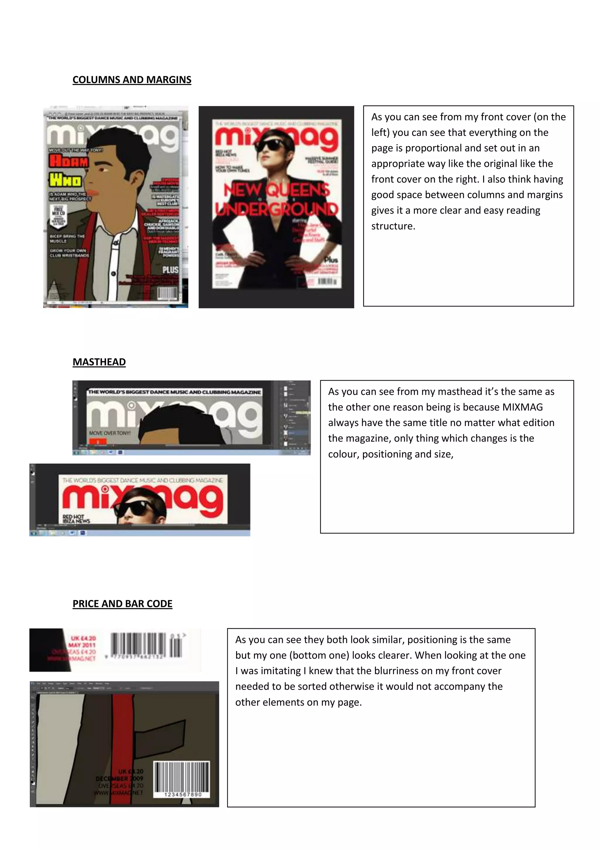 The document provides guidelines for designing a magazine cover and double-page spread that effectively meet the criteria of MIXMAG magazine. It discusses including proportional columns and margins, an appropriate masthead, clear pricing and bar codes, relevant cover lines, catchy headlines, page numbering, justified/centered text, use of bold/italic, and placement of images. The guidelines are intended to help the designer successfully replicate the style of MIXMAG and ensure the cover and spread are well-structured and visually engaging for the target audience.