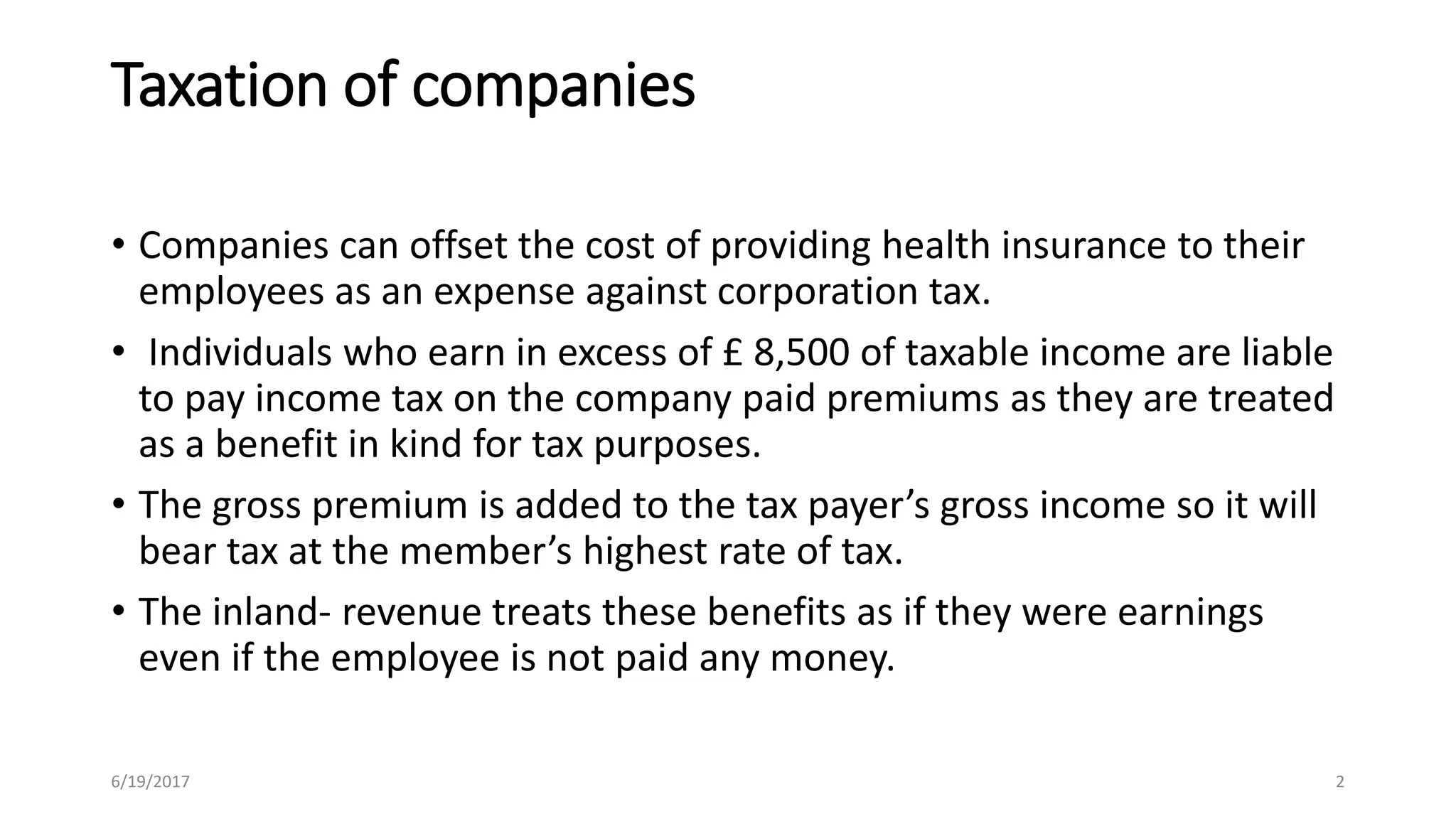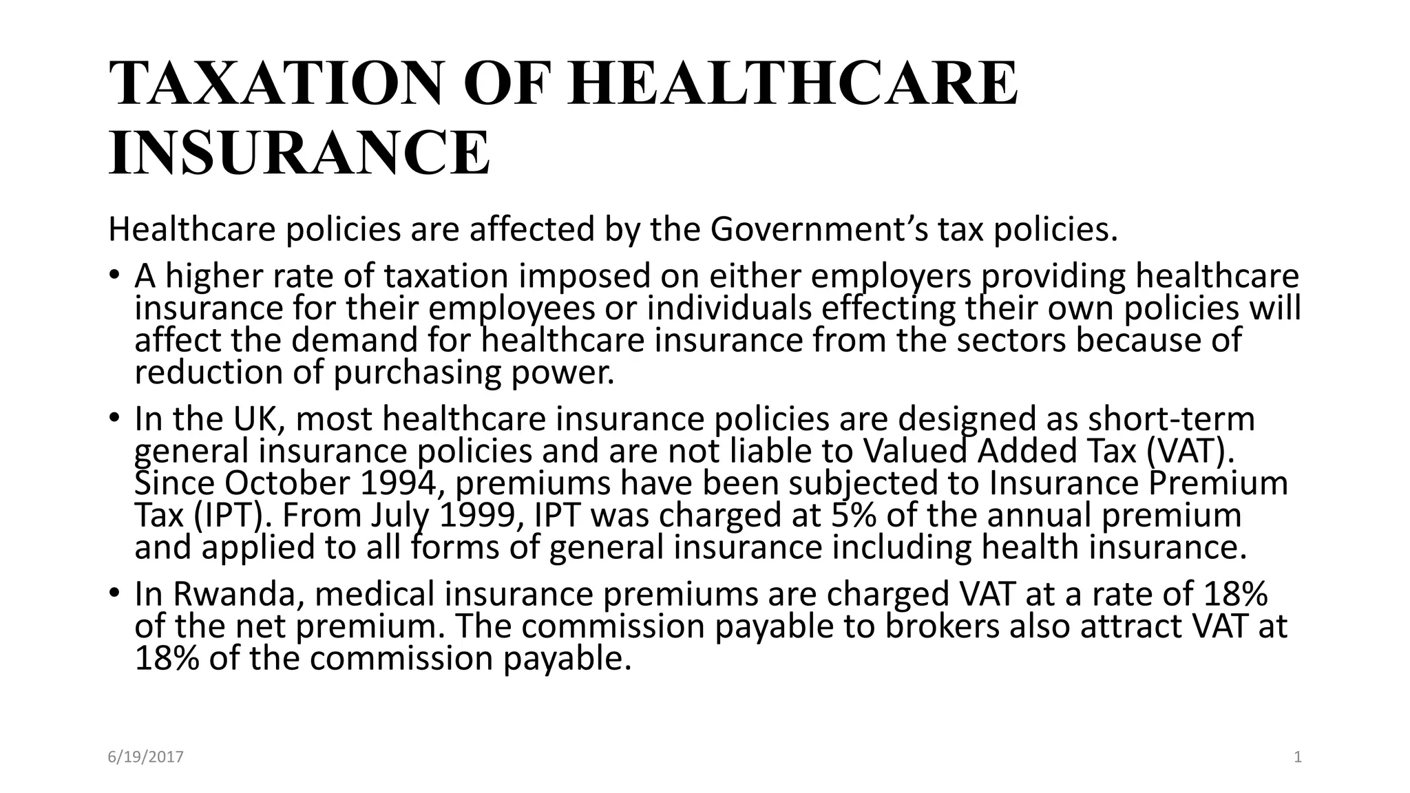 Taxation policies affect the demand for healthcare insurance. In the UK, most health insurance policies are subject to Insurance Premium Tax of 5% of annual premiums. In Rwanda, VAT of 18% is charged on medical insurance premiums and broker commissions. Companies can deduct healthcare insurance premiums for employees as a business expense but employees must pay income tax on premiums as a taxable benefit. Health trusts were developed as an alternative to insurance to avoid Insurance Premium Tax, but come with administrative burdens. Stop-loss insurance protects against high-cost claims and is subject to Premium Tax. Self-insurance, cash policies, and spending from savings are also alternatives to traditional health insurance.