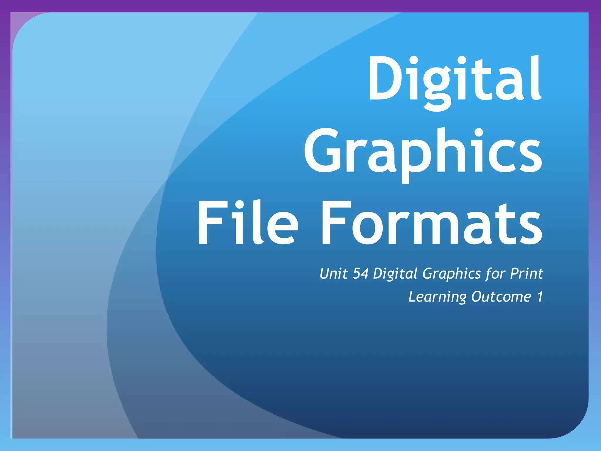 This document provides information on different types of digital graphics file formats including raster graphics like JPEG, TIFF, GIF and BMP as well as vector graphics like PSD, AI, FLA and WMF. It explains the key differences between raster and vector graphics, when each format type would be used, advantages and disadvantages of each format. It also discusses topics like compression, image capture methods, file optimizing, factors that influence file size, and best practices for file naming and asset management.