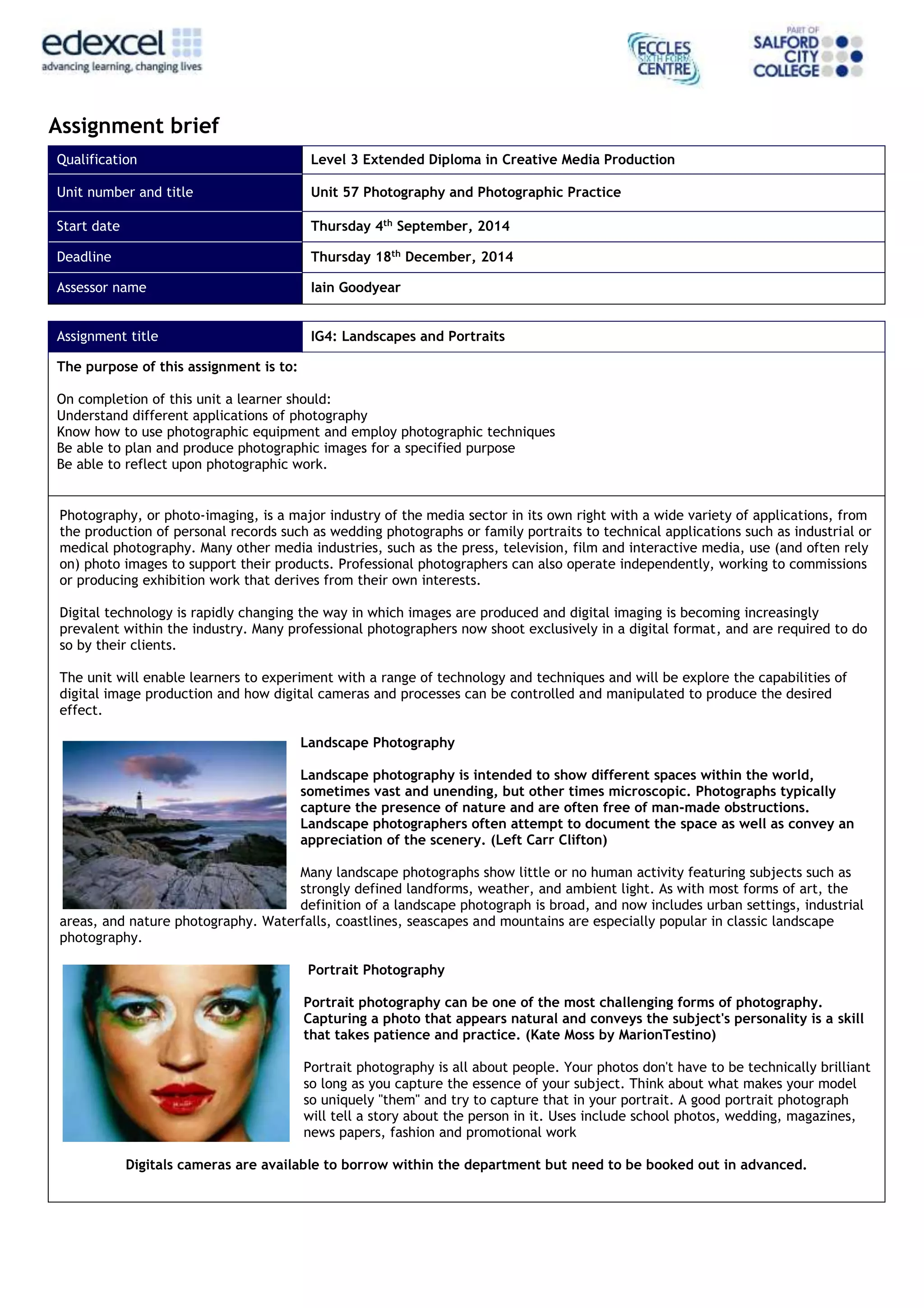 This document provides an assignment brief for a unit on photography. The assignment requires students to complete four tasks: 1) create a blog evaluating different uses of photography; 2) create a PowerPoint on photographic techniques and complete mini photo shoots; 3) complete two photo shoots on landscapes and portraits and select final images; and 4) evaluate the project and select final images. The deadline is December 18th and the assignment aims to develop students' understanding and practical skills in photography.