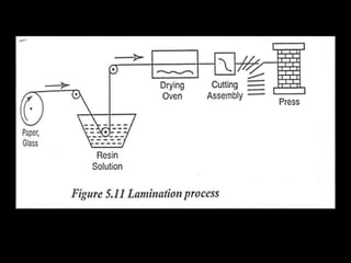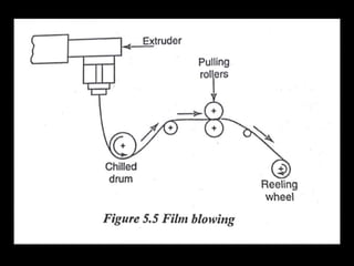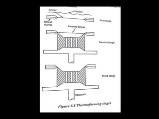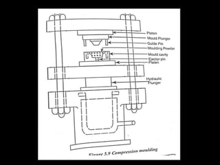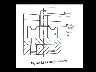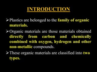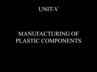 This document discusses the manufacturing of plastic components through various plastic manufacturing processes. It begins by introducing plastics and classifying them as either natural or synthetic organic materials. The two main types of plastics are then described as thermosetting plastics and thermoplastics. Thermosetting plastics harden through a chemical reaction when heated and cannot be remelted or remolded, while thermoplastics soften when heated and harden again when cooled, allowing them to be remolded. Several common types of both thermosetting and thermoplastic materials are then outlined along with their typical uses. Injection molding is introduced as a high-speed manufacturing process for thermoplastics where molten plastic is injected into a