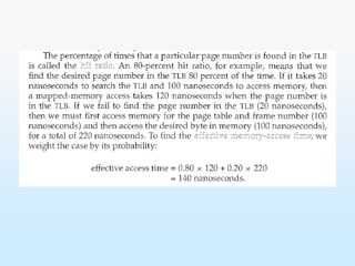 - It describes swapping, where a process is temporarily moved out of memory to disk to make room for other processes. Paging and segmentation are also covered, where memory is divided into pages/segments and logical addresses are translated to physical addresses.