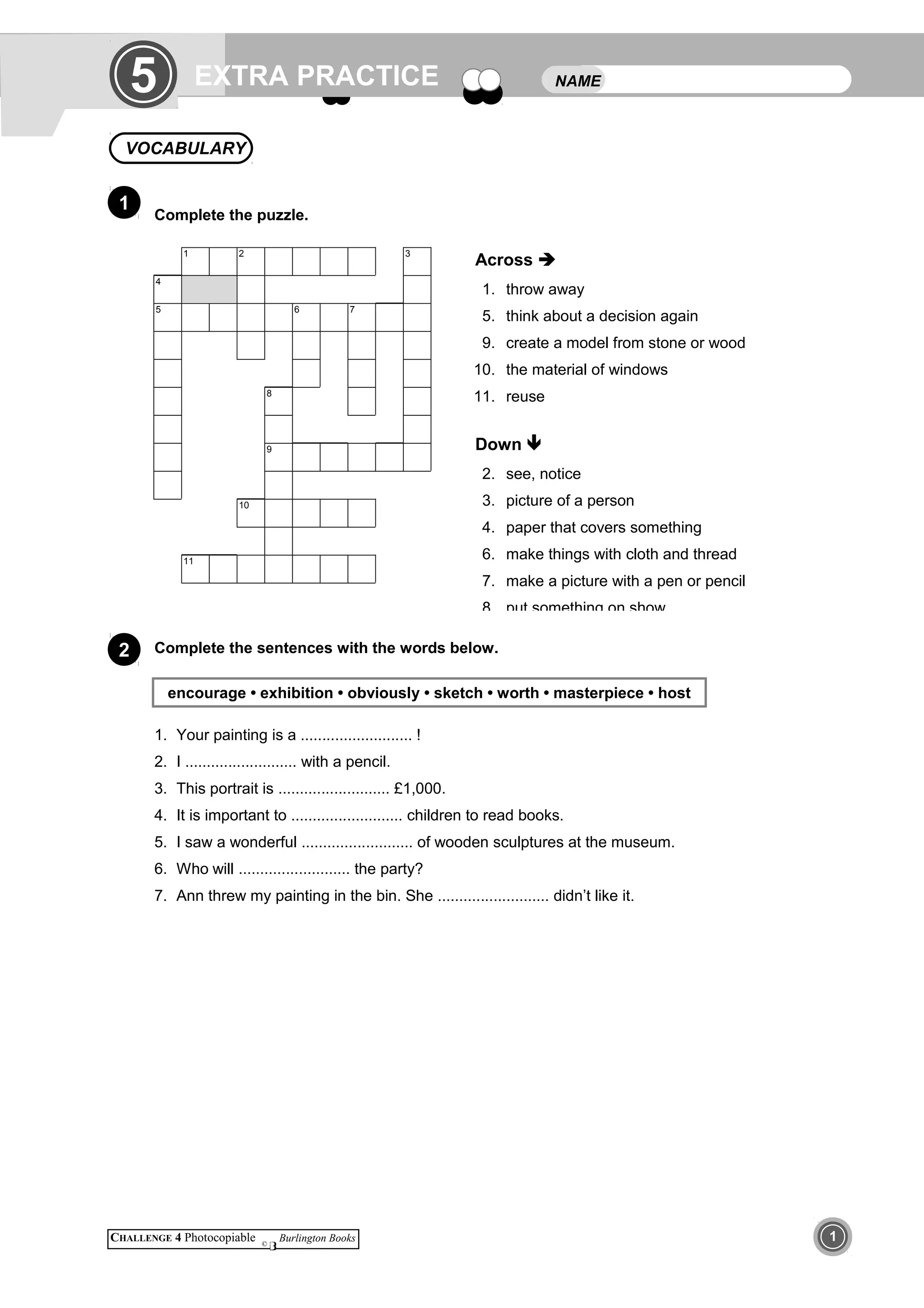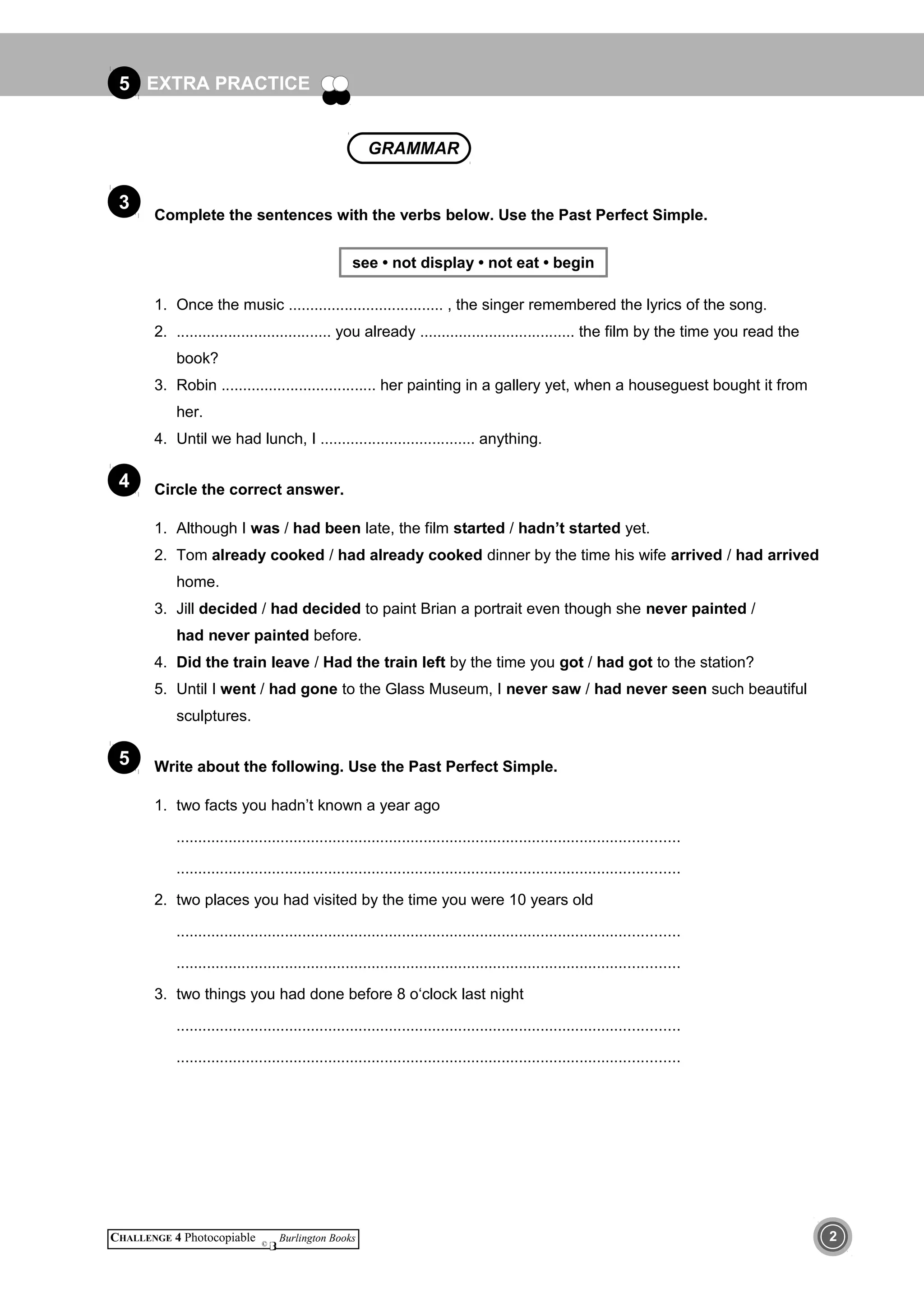 This document contains practice exercises to improve vocabulary and grammar skills. The vocabulary section includes puzzles to match words to their definitions and fill in sentences. The grammar section focuses on using the past perfect tense correctly, with exercises to complete sentences and identify the right tense in examples. It provides supplementary learning material to reinforce key language concepts through a variety of activity types.