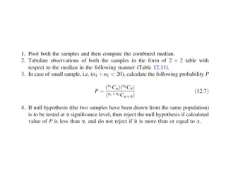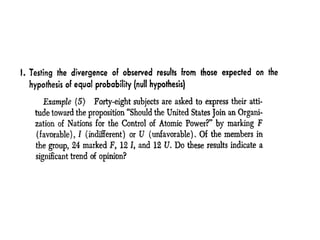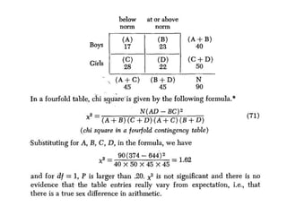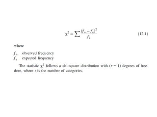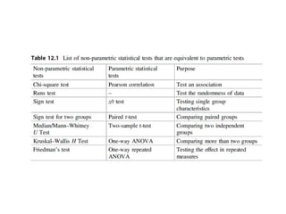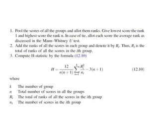 This document provides information about non-parametric tests. It begins by explaining that non-parametric tests do not assume a specific distribution or make assumptions about the population. It then discusses tests for normality like the Kolmogorov-Smirnov test and Shapiro-Wilk test. Commonly used non-parametric tests like Spearman's rank correlation, Mann-Whitney U test, and Kruskal-Wallis H test are explained. The chi-square test and assumptions are also covered in detail. Advantages of non-parametric tests include fewer assumptions and applicability to small sample sizes. A disadvantage is they are less powerful than parametric tests.