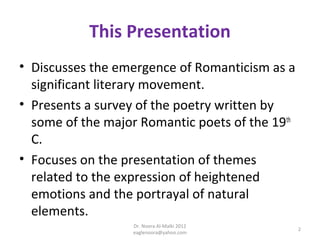 This document provides an overview of a university course on Romantic poetry. The course is titled "Poetry", has the code LANE 447, and is worth 3 credit hours. It will cover works by Coleridge, Lord Byron, Shelley, and Keats. The instructor is Dr. Noora Al-Malki and the course will discuss the emergence of Romanticism as a literary movement and present themes in the featured poems related to heightened emotions and nature.