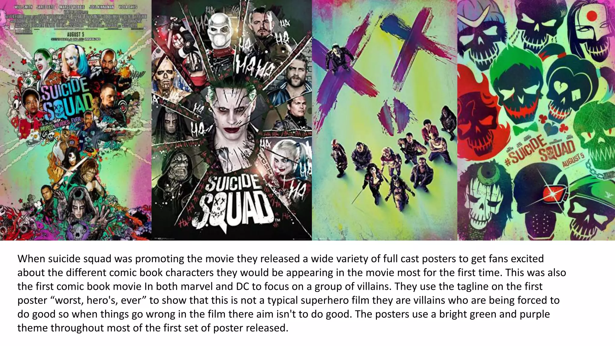 The document discusses the promotional campaign for the 2016 film Suicide Squad. It describes how Warner Brothers released various posters showing the characters to build hype. They focused on villains rather than heroes to make it unique. The posters used bright green and purple colors. They also released character posters, trailers, and put the film on the cover of Empire magazine with the actors. The soundtrack promoted the film and featured popular artists. Comic-Con was used to debut the first trailer. Leading up to release, Warner Brothers put out merchandise, an app, and emoji pack to keep the film in the public conversation.