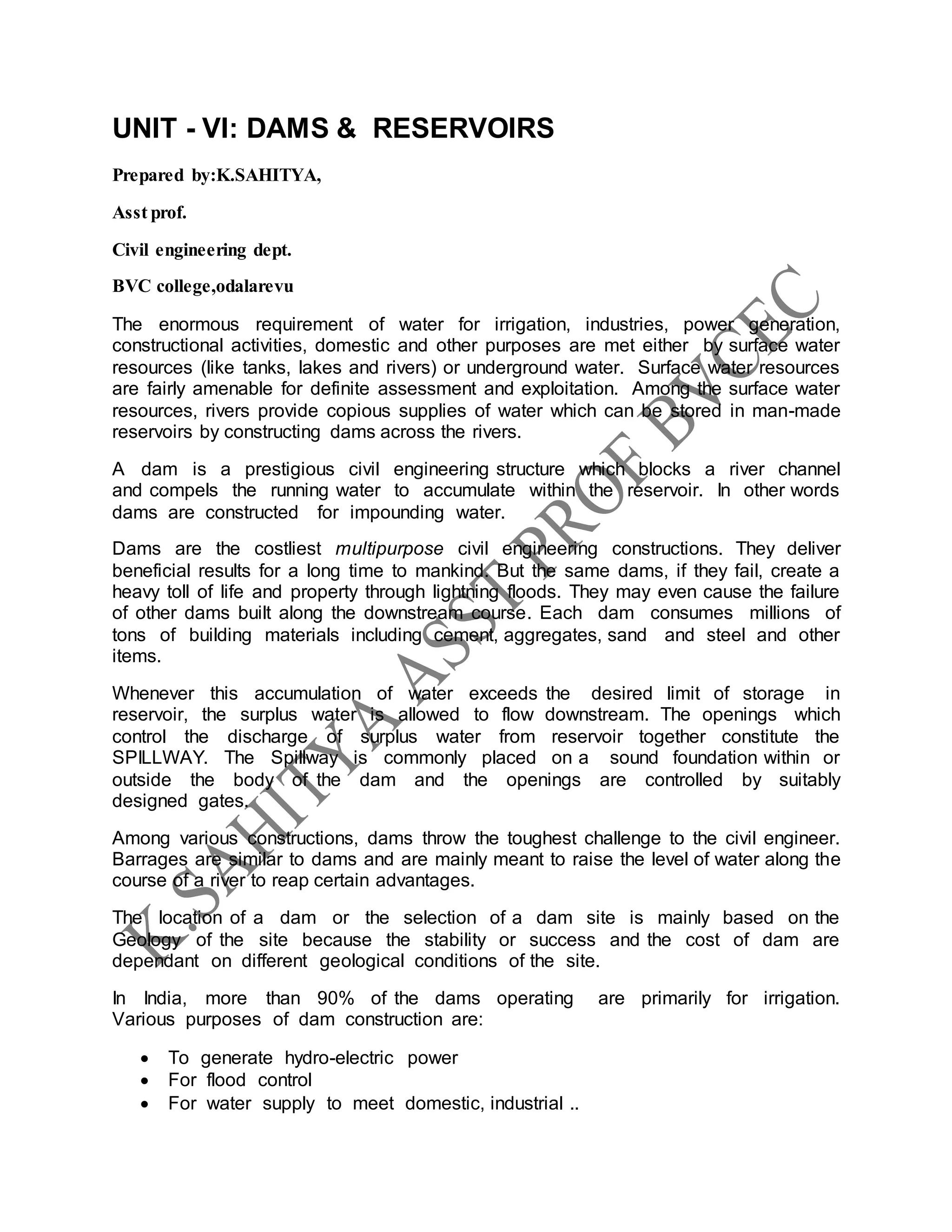 This document provides information about dams and reservoirs. It discusses how dams are constructed across rivers to store water in reservoirs. It describes the different types of dams including gravity dams, buttress dams, arch dams, earth fill dams, and rock fill dams. Key factors in selecting a dam site include the geology of the location, with competent bedrock and an absence of faults or weak zones being important. Dams must also be designed based on the orientation and dip of the underlying rock strata. Extensive exploratory investigations are required at potential dam sites to understand the subsurface geology and suitability for construction.