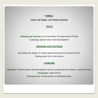 This document provides information and instructions related to a lesson on reality television programs, fame, and social networking. It includes definitions of key terms, descriptions of popular reality shows like The Amazing Race and Who Wants to Be a Millionaire?, grammar rules for expressions using modal verbs and extreme adjectives, speaking activities to discuss reality TV and social media, and a writing activity where students express their opinion about a reality show in 100-150 words for their portfolio.