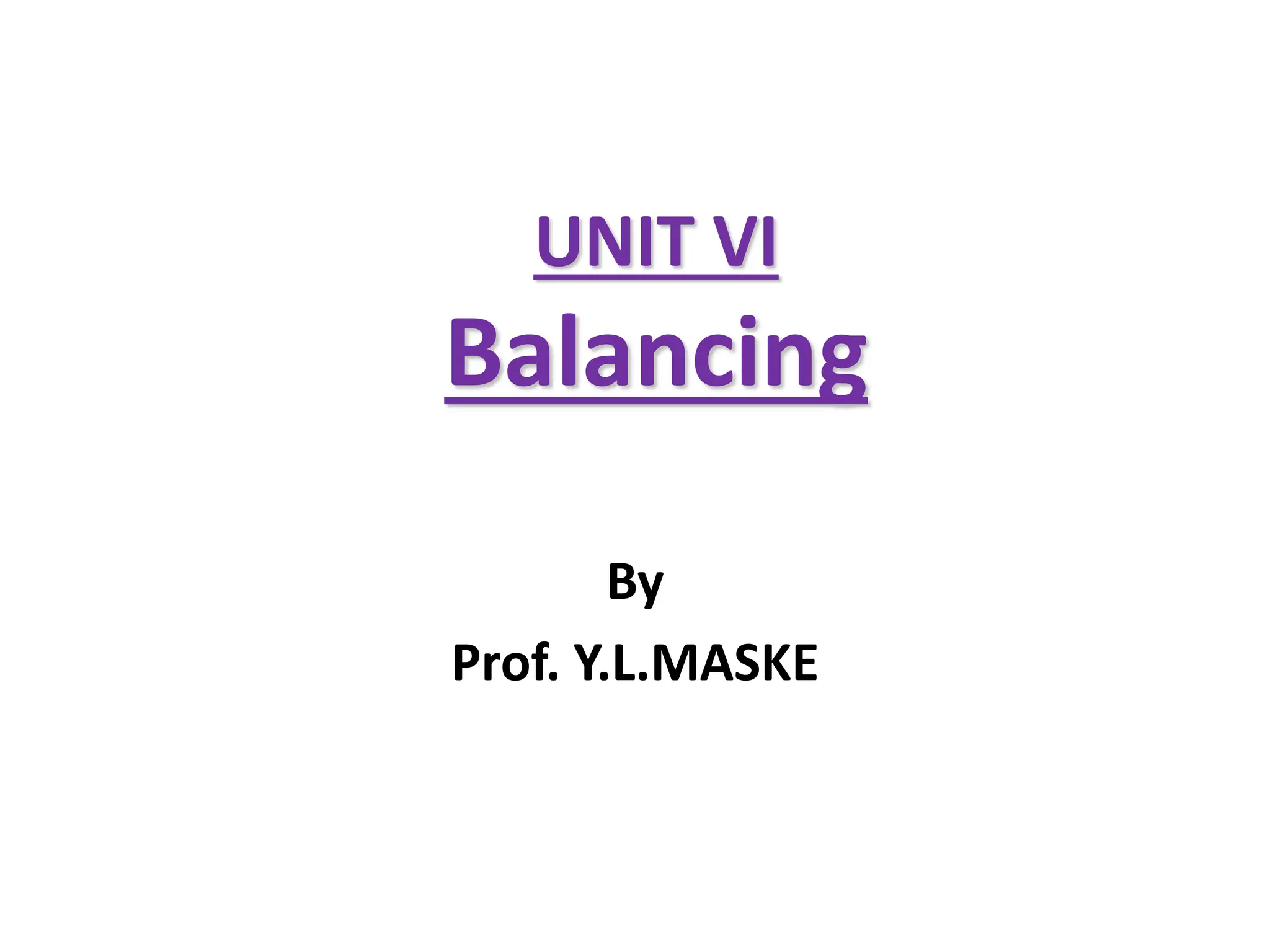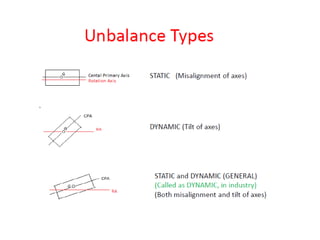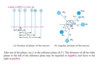 1. The document discusses balancing of rotating and reciprocating machine parts to reduce vibration. Balancing involves analyzing unbalanced forces and designing or modifying parts to eliminate unbalance.