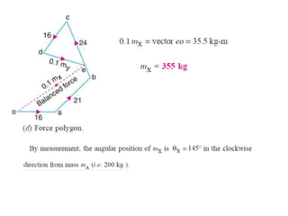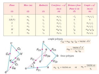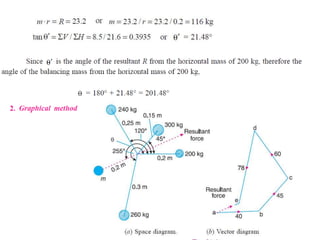 2. There are different methods of balancing depending on whether parts rotate or reciprocate, and whether in the same or different planes. Analytical and graphical methods are provided to calculate balancing masses or positions.