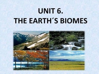 This document describes the major biomes of the world grouped by climate zones. It defines a biome as an area with a characteristic climate and flora and fauna. The biomes are divided into cold, temperate, and hot zones. Biomes in cold zones include the polar biome with permanent ice and snow and tundra vegetation, and alpine biome with vegetation arranged in altitude layers. Biomes in temperate zones include deciduous forests, Mediterranean forests, and taiga boreal forests. Biomes in hot zones include equatorial rainforests, savannas with grass and isolated trees, and deserts with adapted succulent plants. Spain contains alpine, oceanic, Mediterranean, and Canary Island subtropical