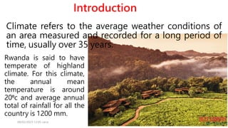 Rwanda experiences a temperate highland climate influenced by its hilly relief and altitude, resulting in variations in temperature and rainfall across different regions. Human activities, such as deforestation and poor agricultural practices, further affect the climate, particularly leading to semi-arid conditions in some areas. The country's climate features two main seasons—wet and dry—along with intricate interactions between natural and anthropogenic factors that shape local weather patterns.