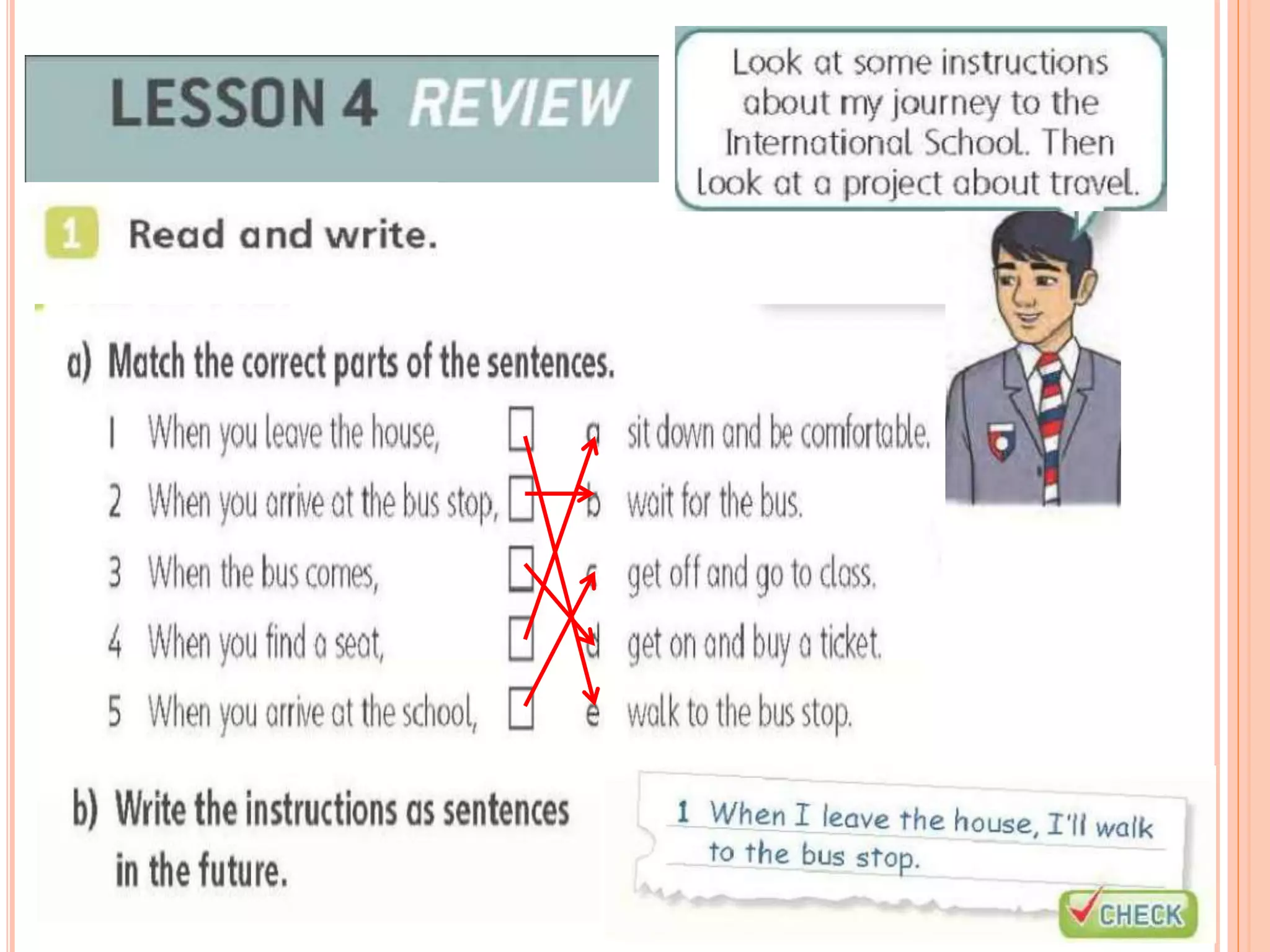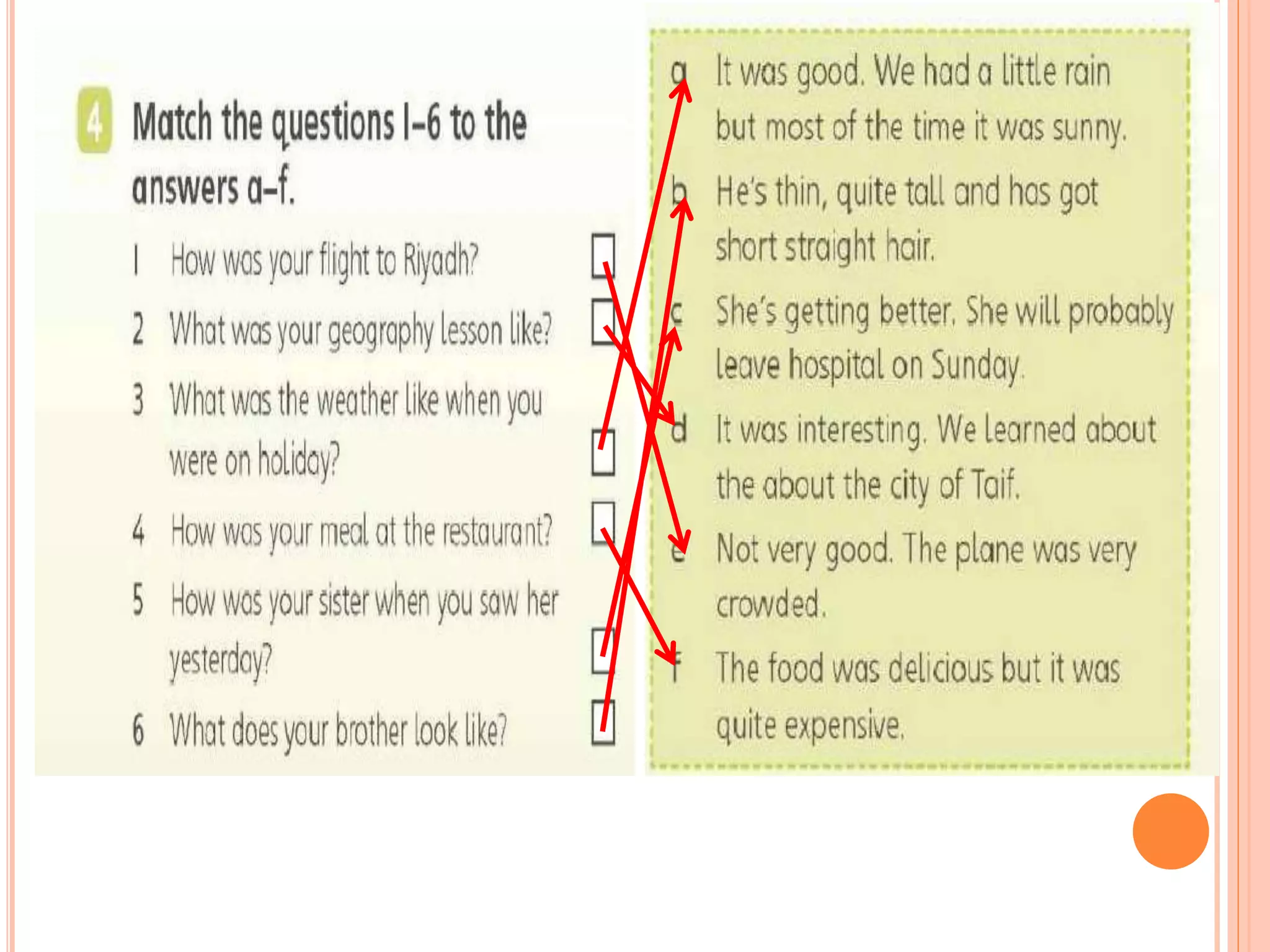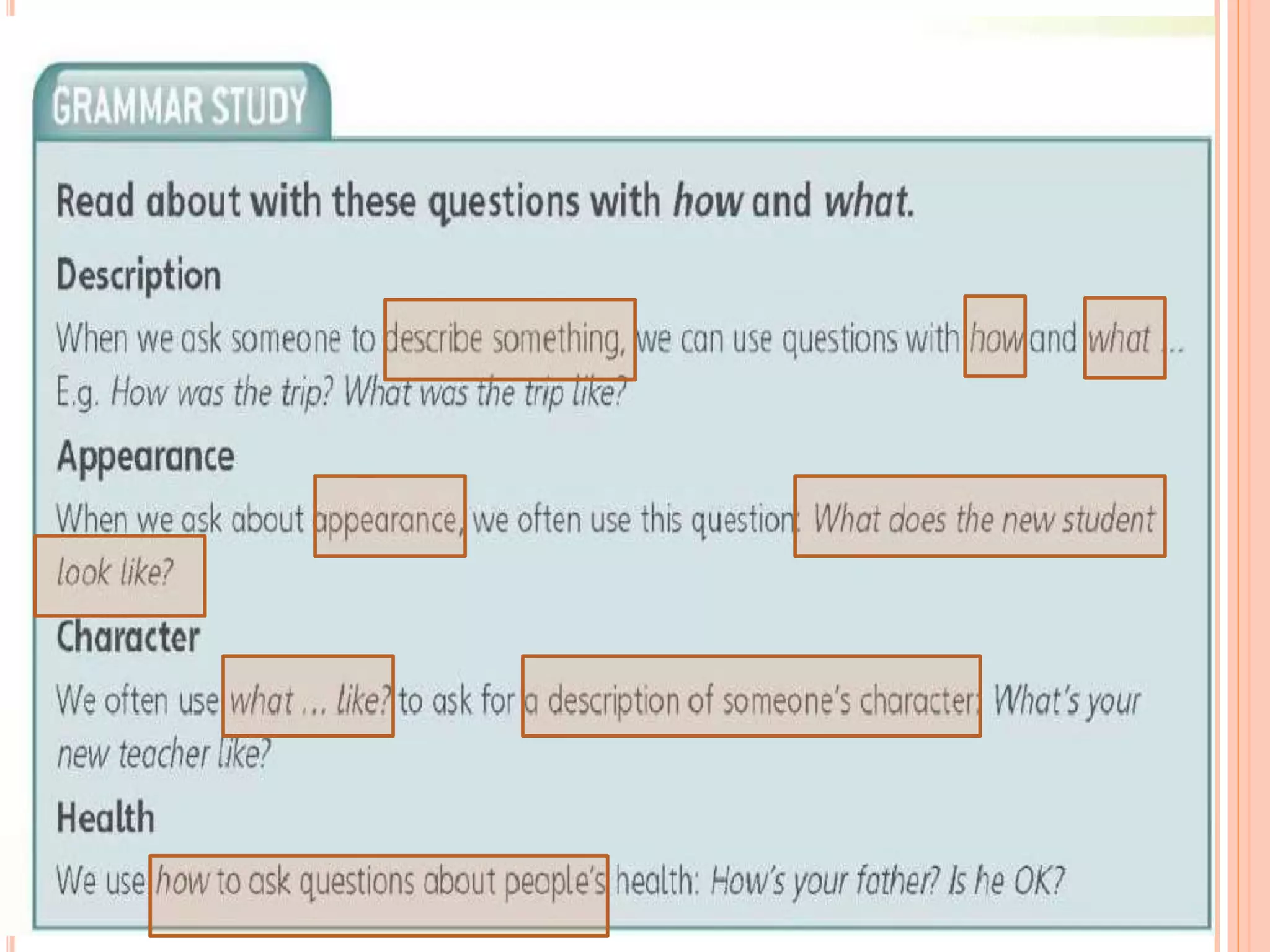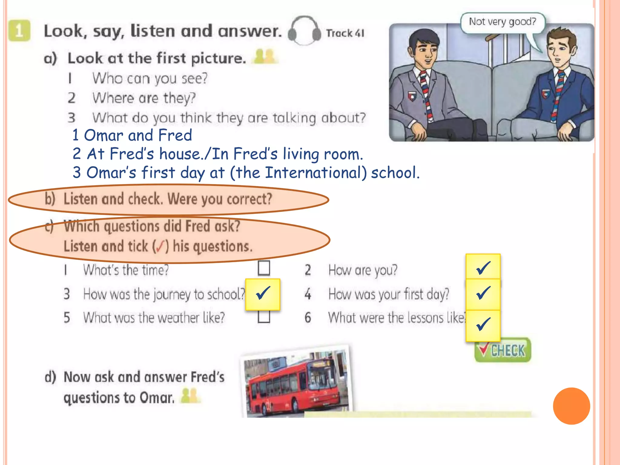 Omar took a taxi to Fred's house for his first day at his new international school. He was still tired from his long flight and fell asleep at Fred's house. The homework assigned includes describing people using adjectives for physical traits and personality, as well as answering questions about weather, appearance, character, and experiences.