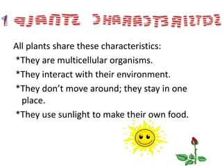 Plants are multicellular organisms that do not move. They perform photosynthesis to produce their own food using sunlight, oxygen from the air, and releasing carbon dioxide. Plants reproduce through seeds and spores and have three main parts - stems, leaves, and roots. The stem carries water and nutrients from the roots to the leaves where photosynthesis occurs, while the roots absorb water and minerals from the soil.