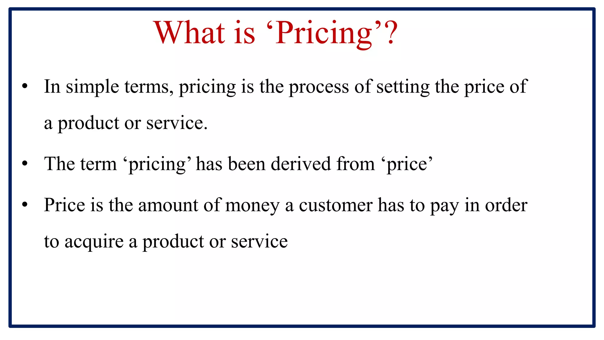 The document discusses pricing and pricing strategies. It defines pricing as the process of setting the price of a product or service. Setting prices can be challenging as prices that are too high will reduce sales and prices that are too low will not generate sufficient revenue. Pricing objectives include earning revenue, increasing sales, beating competition and gaining market share. Key factors that impact pricing are costs, demand, competition and government policies. Common methods for setting prices include cost-plus pricing, value-based pricing and competition-based pricing. Popular pricing strategies are skimming pricing, penetration pricing, dynamic pricing and bundle pricing.