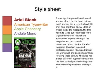 This document outlines the pre-production planning for creating a magazine cover mock-up. It includes potential style sheets, layout designs incorporating game images and headlines, necessary props and locations, contingency planning for potential issues, health and safety considerations, and a schedule for completion over 8 days.