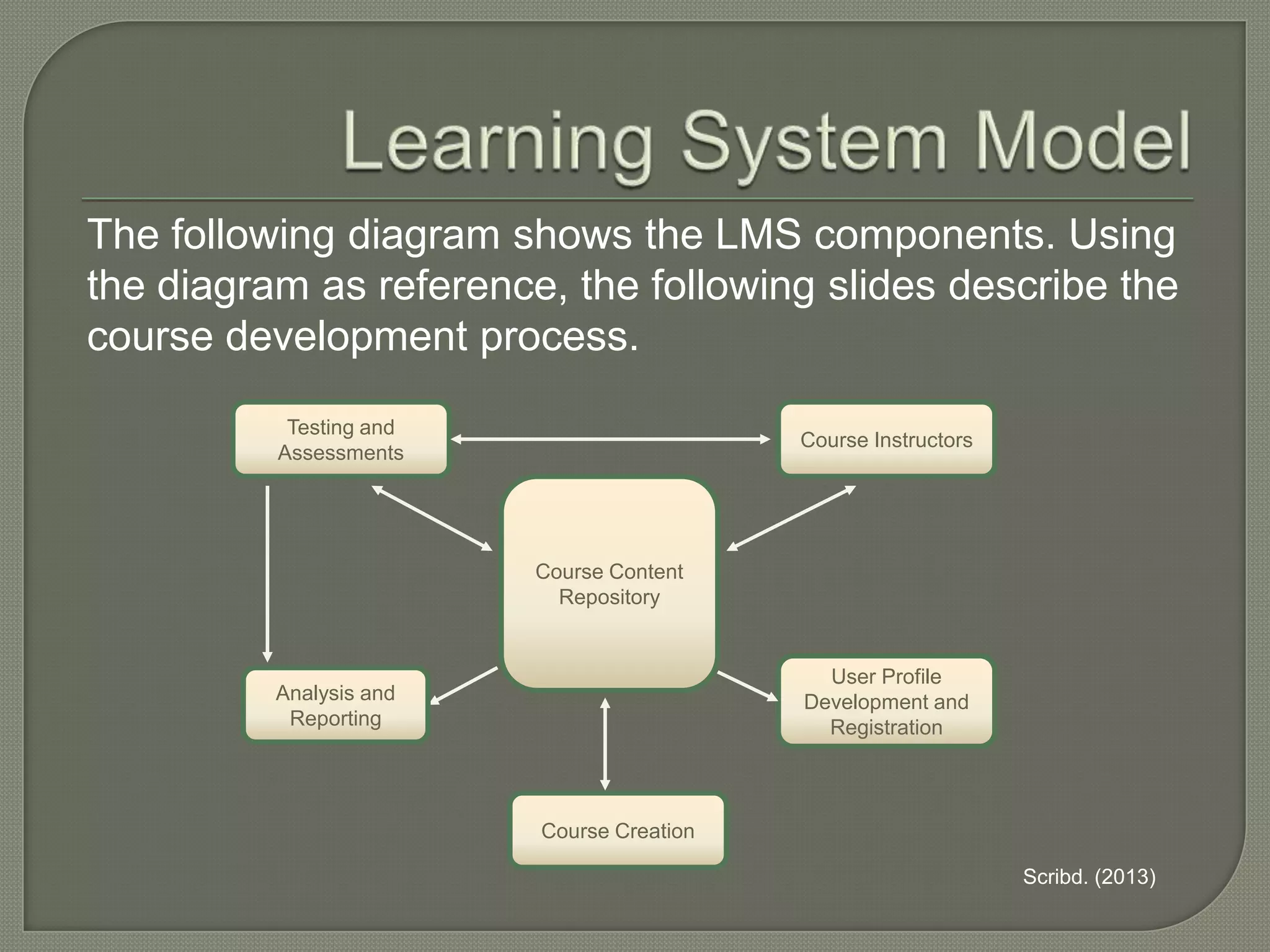 The document describes the components and processes involved in developing and implementing a learning management system (LMS). It includes sections on testing and assessments, course content repository, analysis and reporting, course creation, user profile development and registration, learner tools, support tools, system requirements, and staff roles. The key components are testing and assessments, course content repository, analysis and reporting, course creation, and user profile development. The development process involves thorough testing, organizing course content, analyzing data, creating courses, and developing user profiles in an iterative way.