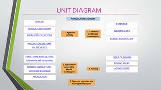 1. The document discusses different types of agriculture across the world including subsistence agriculture, plantations, and market agriculture.