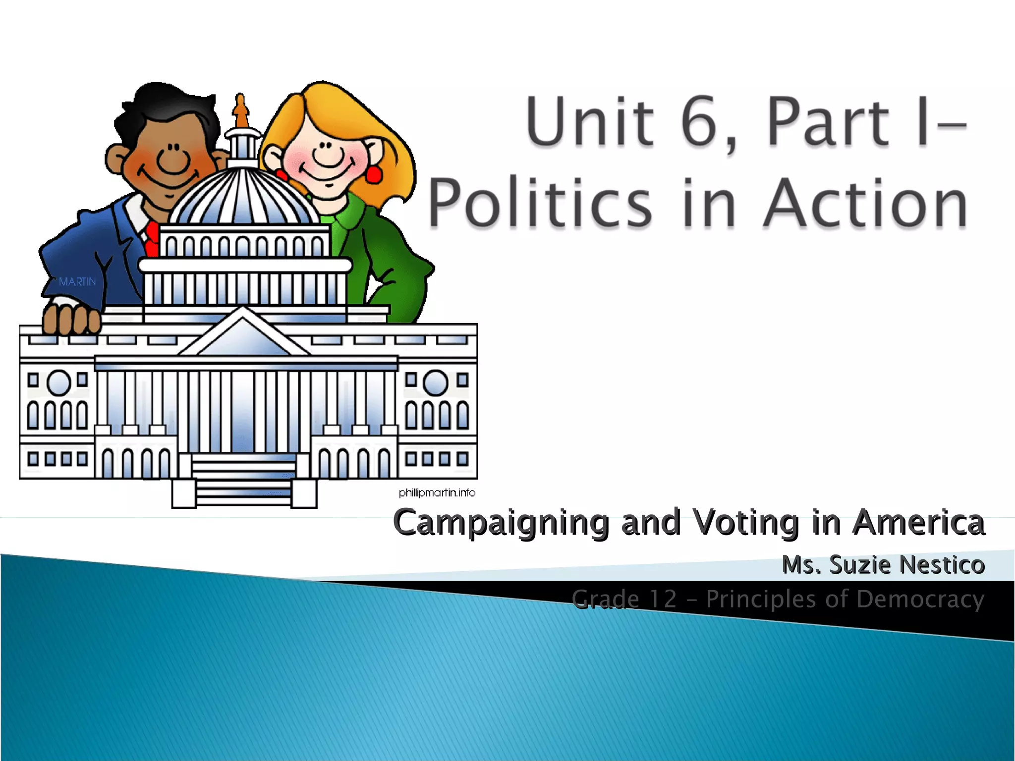 The document discusses various aspects of campaigning and voting in America, including: