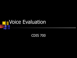 The document outlines the objectives and process for conducting a voice evaluation. The primary objective is to determine if the client has a voice disorder and evaluate symptoms. Additional objectives include patient education and establishing credibility. The evaluation should gather information on referral source, reason for referral, history of the problem, medical history, social history, and oral mechanism exam. Formal assessments include describing vocal qualities, respiratory status, and instrumental measures. The evaluator should rely on auditory perceptions over instrumentation and not make treatment recommendations without an ENT evaluation.