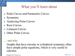 This document discusses polar graphs and equations. It covers topics like polar curves, symmetry properties, analyzing polar curves, rose curves, limaçon curves, and other polar graphs. Specific curves discussed include the spiral of Archimedes, lemniscate curves, and examples of testing polar equations for symmetry and analyzing limaçon curves. It aims to explain polar graphs and equations which are useful in calculus.
