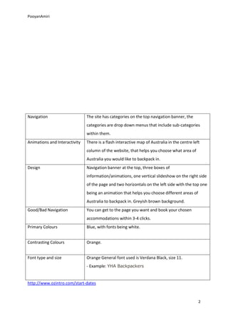 The document provides details about creating an interactive website for Oz Backpackers. It will include pages for home, booking, contact, and about. The home page will feature information about Oz Backpackers and a slideshow of Australian destinations. The booking page will allow users to select accommodation packages, enter personal and contact details, and agree to terms and conditions. The target audience is males and females aged 18-25 who enjoy backpacking. Considerations around security, legal issues, and ethics are also discussed. The design aims to appeal to younger travelers through colors, themes, and simple text styles.
