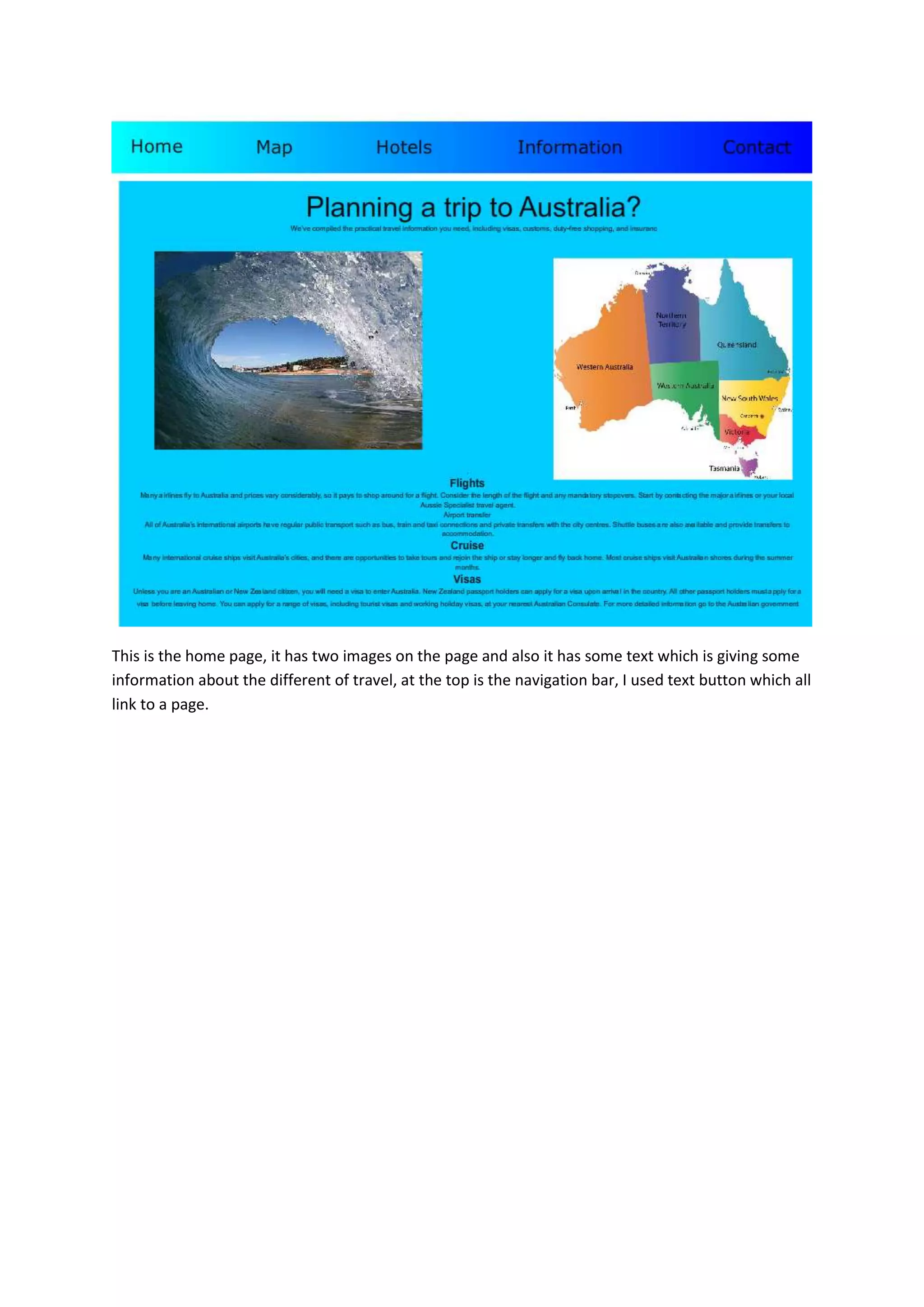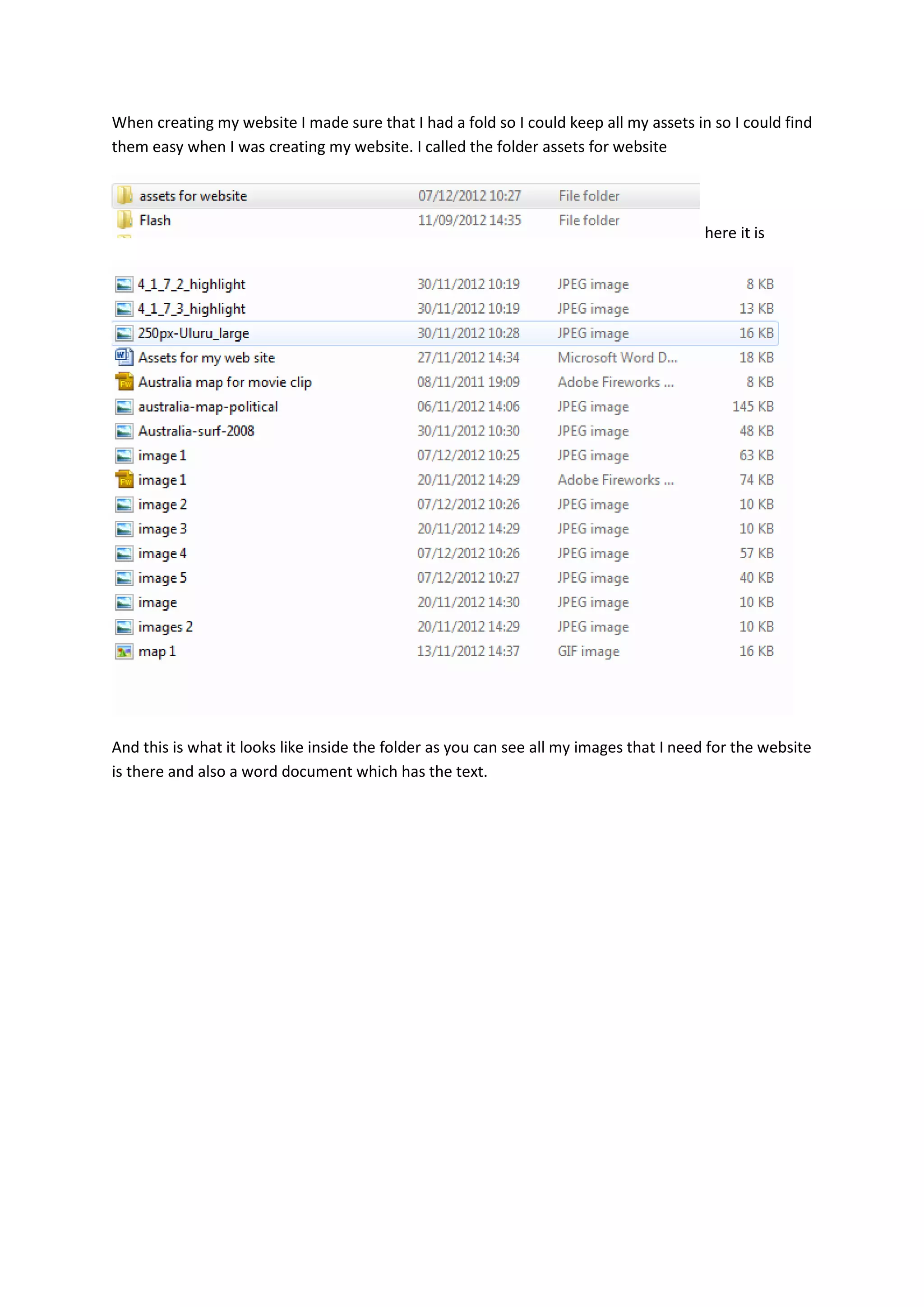 The document describes the structure and contents of a folder called "assets for website" that was created to store and organize assets for a website. The folder contains images and a word document with text that are used across multiple pages of the website, including a home page, map page, hostels page, information page, and contact page. Each page utilizes the navigation bar to link between pages and includes relevant images, text, and interactive elements like dropdown menus and text boxes.