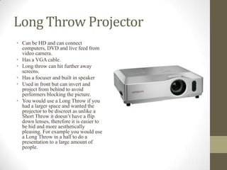 This document provides information about different types of projectors and how to use the Qlab software on Macs. It describes long throw and short throw projectors, noting that long throw projectors can project to larger, more distant screens while short throw projectors are better for closer screens. It also explains that Qlab allows playing multiple videos and audio on Macs when used with a Matrox device, and provides basic steps for using Qlab including adding audio, connecting to a Matrox, and starting playback.